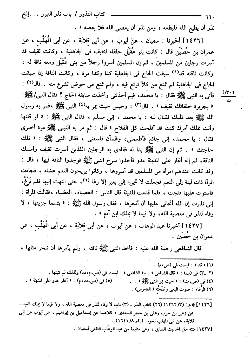 قَالَ الشَّافِعِيُّ : وَالتَّبَرُّرُ أَنْ يَقُولَ لِلَّهِ عَلَيَّ إنْ شَفَى اللَّهُ فُلاَنًا أَوْ قَدِمَ فُلاَنٌ مِنْ سَفَرِهِ أَوْ قَضَى عَنِّي دَيْنًا أَوْ كَانَ كَذَا أَنْ أَحُجَّ لَهُ نَذْرًا فَهُوَ التَّبَرُّرُ . فَأَمَّا إذَا قَالَ : إنْ لَمْ أَقْضِك حَقَّك فَعَلَيَّ الْمَشْيُ إلَى بَيْتِ اللَّهِ فَهَذَا مِنْ مَعَانِي الْأَيْمَانِ لاَ مَعَانِي النُّذُورِ وَأَصْلُ مَعْقُولِ قَوْلِ عَطَاءٍ فِي مَعَانِي النُّذُورِ مِنْ هَذَا أَنَّهُ يَذْهَبُ إلَى أَنَّ مَنْ نَذَرَ نَذْرًا فِي مَعْصِيَةِ اللَّهِ لَمْ يَكُنْ عَلَيْهِ قَضَاؤُهُ وَلاَ كَفَّارَةٌ فَهَذَا يُوَافِقُ السُّنَّةَ وَذَلِكَ أَنْ يَقُولَ : لِلَّهِ عَلَيَّ إنْ شَفَانِي أَوْ شَفَى فُلاَنًا أَنْ أَنْحَرَ ابْنِي أَوْ أَنْ أَفْعَلَ كَذَا مِنْ الْأَمْرِ الَّذِي لاَ يَحِلُّ لَهُ أَنْ يَفْعَلَهُ فَمَنْ قَالَ هَذَا فَلاَ شَيْءَ عَلَيْهِ فِيهِ وَفِي السَّائِبَةِ , وَإِنَّمَا أَبْطَلَ اللَّهُ عَزَّ وَجَلَّ النَّذْرَ فِي الْبَحِيرَةِ وَالسَّائِبَةِ لِأَنَّهَا مَعْصِيَةٌ وَلَمْ يَذْكُرْ فِي ذَلِكَ كَفَّارَةً وَكَانَ فِيهِ دَلاَلَةٌ عَلَى أَنَّ مَنْ نَذَرَ مَعْصِيَةَ اللَّهِ عَزَّ وَجَلَّ أَنْ لاَ يَفِيَ وَلاَ كَفَّارَةَ عَلَيْهِ وَبِذَلِكَ جَاءَتْ السُّنَّةُ أَخْبَرَنَا الرَّبِيعُ قَالَ أَخْبَرَنَا الشَّافِعِيُّ قَالَ أَخْبَرَنَا مَالِكٌ عَنْ طَلْحَةَ بْنِ عَبْدِ الْمَلِكِ الْأَيْلِيِّ عَنْ الْقَاسِمِ بْنِ مُحَمَّدٍ عَنْ عَائِشَةَ رضي الله عنها أَنَّ النَّبِيَّ - صلى الله عليه وسلم - قَالَ { مَنْ@