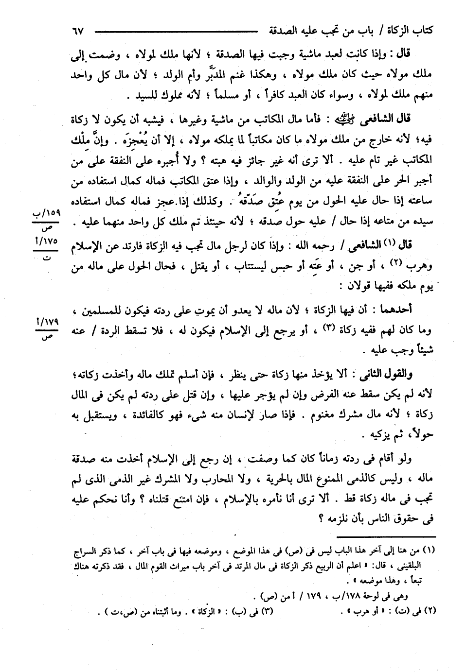قَالَ الشَّافِعِيُّ : رحمه الله تعالى وَتَجِبُ الصَّدَقَةُ عَلَى كُلِّ مَالِكٍ تَامِّ الْمِلْكِ مِنْ الْأَحْرَارِ , وَإِنْ كَانَ صَبِيًّا , أَوْ مَعْتُوهًا , أَوْ امْرَأَةً لاَ افْتِرَاقَ فِي ذَلِكَ بَيْنَهُمْ كَمَا يَجِبُ فِي مَالِ كُلِّ وَاحِدٍ مَا لَزِمَ مَالَهُ بِوَجْهٍ مِنْ الْوُجُوهِ جِنَايَةٌ , أَوْ مِيرَاثٌ مِنْهُ , أَوْ نَفَقَةٌ عَلَى وَالِدِيهِ , أَوْ وَلَدٍ زَمِنٍ مُحْتَاجٍ وَسَوَاءٌ كَانَ فِي الْمَاشِيَةِ , وَالزَّرْعِ , وَالنَّاضِّ , وَالتِّجَارَةِ وَزَكَاةِ الْفِطْرِ لاَ يَخْتَلِفُ@