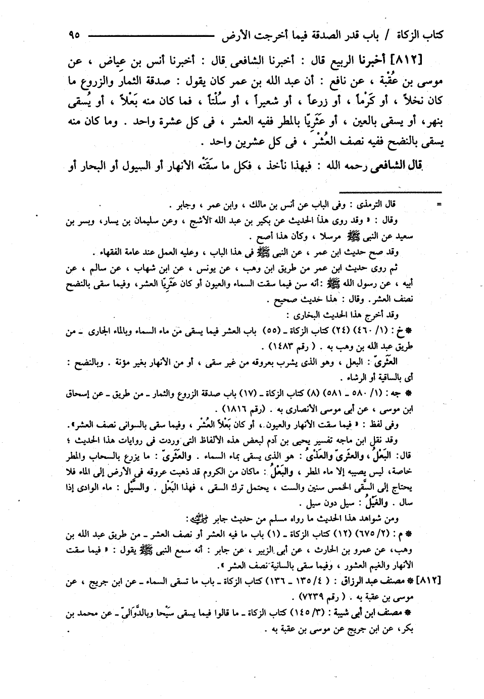 قَالَ الشَّافِعِيُّ : رحمه الله : بَلَغَنِي أَنَّ رَسُولَ اللَّهِ - صلى الله عليه وسلم - قَالَ قَوْلاً مَعْنَاهُ { مَا سُقِيَ بِنَضْحٍ , أَوْ غَرْبٍ فَفِيهِ نِصْفُ الْعُشْرِ وَمَا سُقِيَ بِغَيْرِهِ مِنْ عَيْنٍ , أَوْ سَمَاءٍ فَفِيهِ الْعُشْرُ } .