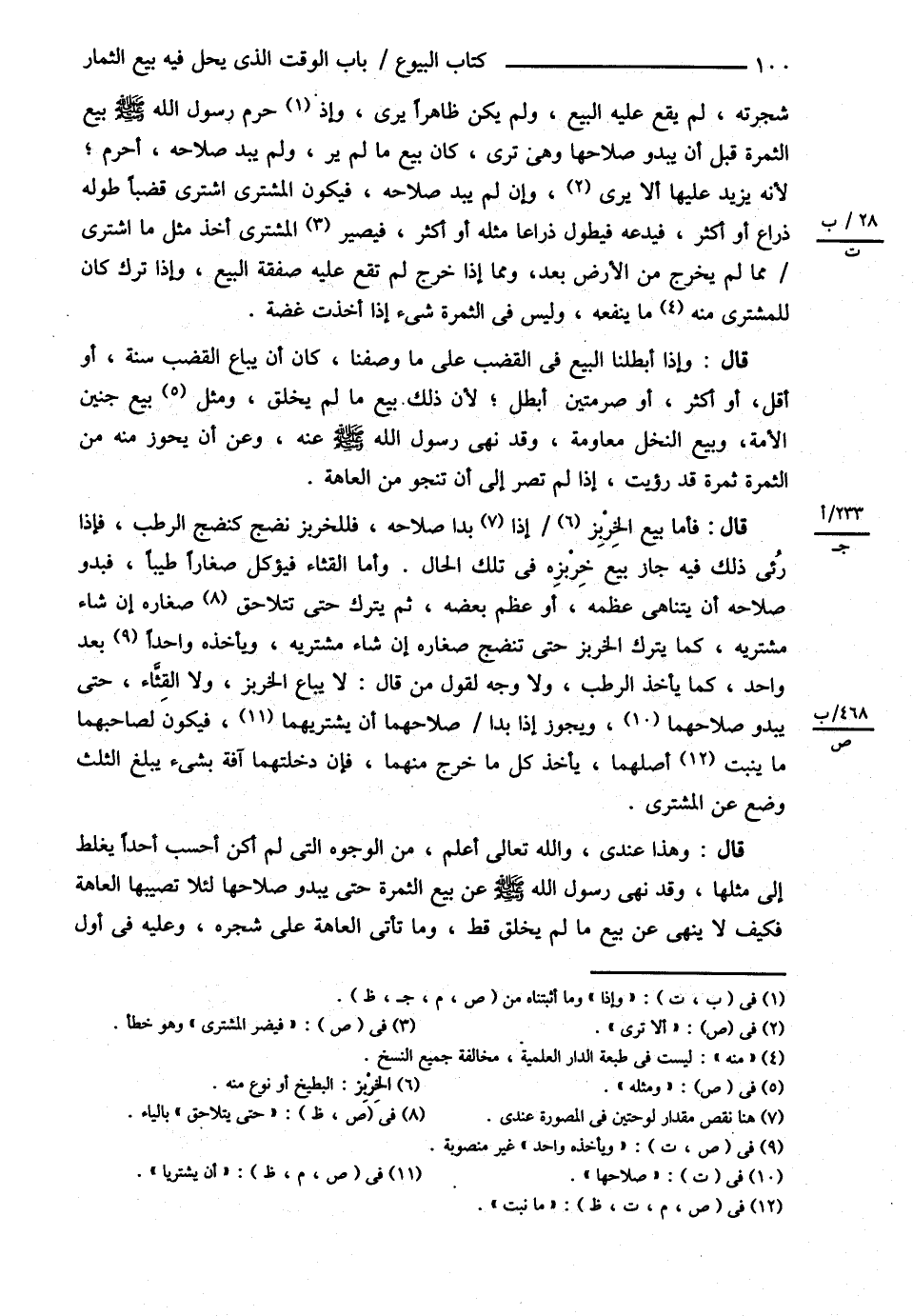 ( قَالَ ) : فَأَمَّا بَيْعُ الْخِرْبِزِ إذَا بَدَا صَلاَحُهُ فَلِلْخِرْبِزِ نُضْجٌ كَنُضْجِ الرُّطَبِ فَإِذَا رُئِيَ ذَلِكَ فِيهِ جَازَ بَيْعُ خِرْبِزِهِ فِي تِلْكَ الْحَالِ , وَأَمَّا الْقِثَّاءُ فَيُؤْكَلُ صِغَارًا طَيِّبًا فَبُدُوُّ صَلاَحِهِ أَنْ يَتَنَاهَى عِظَمُهُ أَوْ عِظَمُ بَعْضِهِ ثُمَّ يُتْرَكُ حَتَّى تَتَلاَحَقَ صِغَارُهُ إنْ شَاءَ مُشْتَرِيهِ كَمَا يُتْرَكُ الْخِرْبِزِ حَتَّى تَنْضُجَ صِغَارُهُ إنْ شَاءَ مُشْتَرِيهِ وَيَأْخُذُهُ وَاحِدًا بَعْدَ وَاحِدٍ كَمَا يَأْخُذُ الرُّطَبَ وَلاَ وَجْهَ لِقَوْلِ مَنْ قَالَ لاَ يُبَاعُ الْخِرْبِزِ وَلاَ الْقِثَّاءُ حَتَّى يَبْدُوَ صَلاَحُهُمَا وَيَجُوزُ إذَا بَدَا صَلاَحُهُمَا أَنْ يَشْتَرِيَهُمَا فَيَكُونَ لِصَاحِبِهِمَا مَا يُنْبِتُ أَصْلَهُمَا يَأْخُذُ كُلَّ مَا خَرَجَ مِنْهُمَا فَإِنْ دَخَلَهُمَا آفَةٌ بِشَيْءٍ يَبْلُغُ الثُّلُثَ وُضِعَ عَنْ الْمُشْتَرِي ..