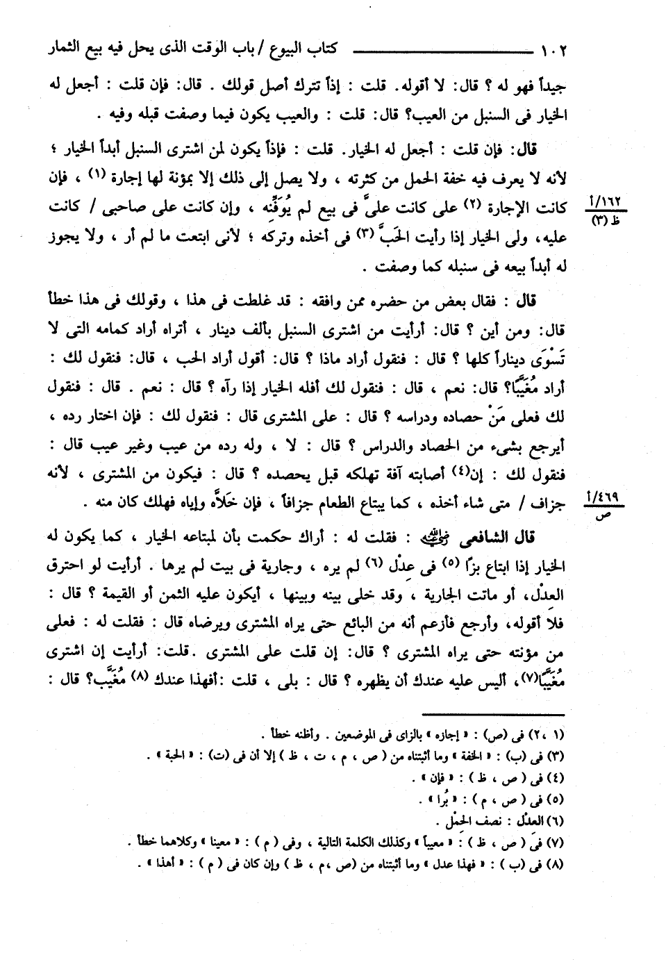 قال : فَقَالَ بَعْضُ مَنْ حَضَرَهُ مِمَّنْ وَافَقَهُ قَدْ غَلِطْت فِي هَذَا وَقَوْلُك فِي هَذَا خَطَأٌ قَالَ وَمِنْ أَيْنَ ؟ قَالَ أَرَأَيْت مَنْ اشْتَرَى السُّنْبُلَ بِأَلْفِ دِينَارٍ أَتَرَاهُ أَرَادَ كِمَامَهُ الَّتِي لاَ تَسْوَى دِينَارًا كُلُّهَا ؟ قَالَ فَنَقُولُ أَرَادَ مَاذَا ؟ قَالَ أَقُولُ أَرَادَ الْحَبَّ قَالَ فَنَقُولُ لَك أَرَادَ مُغَيَّبًا ؟ قَالَ نَعَمْ قَالَ فَنَقُولُ لَك أَفَلَهُ الْخِيَارُ إذَا رَآهُ ؟ قَالَ نَعَمْ قَالَ فَنَقُولُ لَك فَعَلَى مَنْ حَصَادُهُ وَدِرَاسُهُ ؟ قَالَ عَلَى الْمُشْتَرِي قَالَ فَنَقُولُ لَك فَإِنْ اخْتَارَ رَدَّهُ أَيَرْجِعُ بِشَيْءٍ مِنْ الْحَصَادِ وَالدِّرَاسِ ؟ قَالَ لاَ وَلَهُ رَدُّهُ مِنْ عَيْبٍ وَغَيْرِ عَيْبٍ قَالَ فَنَقُولُ لَك فَإِنْ أَصَابَتْهُ آفَةٌ تُهْلِكُهُ قَبْلَ يَحْصُدَهُ ؟ قَالَ فَيَكُونُ مِنْ الْمُشْتَرِي ; لِأَنَّهُ جُزَافٌ مَتَى شَاءَ أَخَذَهُ كَمَا يُبْتَاعُ الطَّعَامُ جُزَافًا فَإِنْ خَلَّاهُ وَإِيَّاهُ فَهَلَكَ كَانَ مِنْهُ .