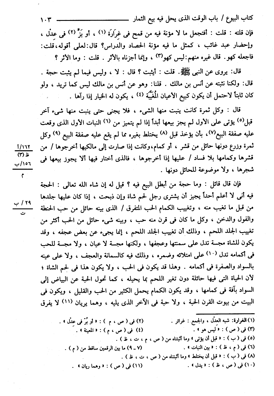 فَإِنْ قُلْته ؟ قُلْت أَفَتَجْعَلُ مَا لاَ مُؤْنَةَ فِيهِ مِنْ قَمْحٍ فِي غِرَارَةٍ أَوْ بِزِفَّيْ عَدْلٍ وَإِحْضَارِ عَبْدٍ غَائِبٍ كَمِثْلِ مَا فِيهِ مُؤْنَةُ الْحَصَادِ وَالدِّرَاسِ ؟ قَالَ لِعَلَيَّ أَقُولُهُ قُلْت فَاجْعَلْهُ كَهُوَ قَالَ غَيْرُهُ مِنْهُمْ لَيْسَ كَهُوَ وَإِنَّمَا أَجَزْنَاهُ بِالْأَثَرِ قُلْت وَمَا الْأَثَرُ ؟ قَالَ يُرْوَى عَنْ النَّبِيِّ - صلى الله عليه وسلم - قُلْت أَيَثْبُتُ قَالَ لاَ وَلَيْسَ فِيمَا لَمْ يَثْبُتْ حُجَّةٌ قَالَ وَلَكِنَّا نُثْبِتُهُ عَنْ أَنَسِ بْنِ مَالِكٍ قُلْنَا , وَهُوَ عَنْ أَنَسِ بْنِ مَالِكٍ لَيْسَ كَمَا تُرِيدُ وَلَوْ كَانَ ثَابِتًا لاَحْتَمَلَ أَنْ يَكُونَ كَبَيْعِ الْأَعْيَانِ الْمُغَيَّبَةِ يَكُونُ لَهُ الْخِيَارُ إذَا رَآهَا قَالَ وَكُلُّ ثَمَرَةٍ كَانَتْ يَنْبُتُ ؟ مِنْهَا الشَّيْءُ فَلاَ يُجْنَى حَتَّى يَنْبُتَ مِنْهَا شَيْءٌ آخَرُ قَبْلَ أَنْ يُؤْتَى عَلَى الْأَوَّلِ لَمْ يَجُزْ بَيْعُهَا أَبَدًا إذَا لَمْ يَتَمَيَّزْ مِنْ النَّبَاتِ الْأَوَّلِ الَّذِي وَقَعَتْ عَلَيْهِ صَفْقَةُ الْبَيْعِ بِأَنْ يُؤْخَذَ قَبْلَ أَنْ يَخْتَلِطَ بِغَيْرِهِ مِمَّا لَمْ يَقَعْ عَلَيْهِ صَفْقَةُ الْبَيْعِ وَكُلُّ ثَمَرَةٍ وَزَرْعٍ دُونَهَا حَائِلٌ مِنْ قِشْرٍ أَوْ كِمَامٍ , وَكَانَتْ إذَا صَارَتْ إلَى مَالِكِيهَا أَخْرَجُوهَا مِنْ قِشْرَتِهَا وَكِمَامِهَا بِلاَ فَسَادٍ عَلَيْهَا إذَا أَخْرَجُوهَا فَاَلَّذِي اخْتَارَ فِيهَا أَنْ لاَ يَجُوزَ بَيْعُهَا فِي شَجَرِهَا وَلاَ مَوْضُوعِهِ لِلْحَائِلِ دُونَهَا . فَإِنْ قَالَ قَائِلٌ وَمَا حُجَّةُ مَنْ أَبْطَلَ الْبَيْعَ فِيهِ ؟ قِيلَ لَهُ إنْ شَاءَ اللَّهُ تَعَالَى الْحُجَّةُ فِيهِ أَنِّي لاَ أَعْلَمُ أَحَدًا يُجِيزُ أَنْ يَشْتَرِيَ رَجُلٌ لَحْمَ شَاةٍ , وَإِنْ ذُبِحَتْ إذَا كَانَ عَلَيْهَا جِلْدُهَا مِنْ قَبْلِ مَا تَغِيبُ مِنْهُ وَتُغَيِّبُ الْكِمَامُ الْحَبَّ الْمُتَفَرِّقَ الَّذِي بَيْنَهُ حَائِلٌ مِنْ حَبِّ الْحِنْطَةِ وَالْفُولِ وَالدُّخْنِ وَكُلِّ مَا كَانَ فِي قَرْنٍ مِنْهُ حَبٌّ وَبَيْنَهُ شَيْءٌ حَائِلٌ مِنْ الْحَبِّ أَكْثَرَ مِنْ تَغْيِيبِ الْجِلْدِ لِلَّحْمِ وَذَلِكَ أَنَّ تَغَيُّبَ الْجِلْدِ لِلَّحْمِ إنَّمَا يَجِيءُ عَنْ بَعْضِ عَجَفِهِ وَقَدْ يَكُونُ لِلشَّاةِ مِجَسَّةٌ تَدُلُّ عَلَى سَمَانَتِهَا وَعَجَفِهَا وَلَكِنَّهَا مِجَسَّةٌ لاَ عِيَانَ وَلاَ مِجَسَّةَ لِلْحَبِّ فِي أَكْمَامِهِ تَدُلُّ عَلَى امْتِلاَئِهِ وَضَمْرِهِ وَذَلِكَ فِيهِ كَالسَّمَانَةِ وَالْعَجَفِ وَلاَ عَلَى عَيْنِهِ بِالسَّوَادِ وَالصُّفْرَةِ فِي أَكْمَامِهِ وَهَذَا قَدْ يَكُونُ فِي الْحَبِّ وَلاَ يَكُونُ هَذَا فِي لَحْمِ الشَّاةِ ; لِأَنَّ الْحَيَاةَ الَّتِي فِيهَا حَائِلَةٌ دُونَ تَغَيُّرِ اللَّحْمِ بِمَا يُحِيلُهُ كَمَا تُحَوَّلُ الْحَبَّةُ عَنْ الْبَيَاضِ إلَى السَّوَادِ بِآفَةٍ فِي كِمَامِهَا , وَقَدْ يَكُونُ الْكِمَامُ يَحْمِلُ الْكَثِيرَ مِنْ الْحَبِّ وَالْقَلِيلَ وَيَكُونُ فِي الْبَيْتِ مِنْ بُيُوتِ الْقَرْنِ الْحَبَّةُ وَلاَ حَبَّةَ فِي الْآخَرِ الَّذِي يَلِيهِ وَهُمَا يَرَيَانِ لاَ يُفَرَّقُ @
