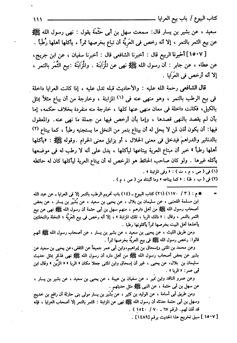 سَعِيدٍ عَنْ بُشَيْرِ بْنِ يَسَارٍ قَالَ سَمِعْت سَهْلَ بْنَ أَبِي حَثْمَةَ يَقُولُ { نَهَى رَسُولُ اللَّهِ صلى الله تعالى عليه وسلم عَنْ بَيْعِ التَّمْرِ بِالتَّمْرِ إلَّا أَنَّهُ رَخَّصَ فِي الْعَرِيَّةِ أَنْ تُبَاعَ بِخَرْصِهَا تَمْرًا يَأْكُلُهَا أَهْلُهَا رُطَبًا } . ( أَخْبَرَنَا الرَّبِيعُ ) : قَالَ أَخْبَرَنَا الشَّافِعِيُّ قَالَ أَخْبَرَنَا سُفْيَانُ عَنْ ابْنِ جُرَيْجٍ عَنْ عَطَاءٍ عَنْ جَابِرٍ أَنَّ رَسُولَ اللَّهِ - صلى الله عليه وسلم - { نَهَى عَنْ الْمُزَابَنَةِ } وَالْمُزَابَنَةُ بَيْعُ التَّمْرِ بِالتَّمْرِ إلَّا أَنَّهُ أَرْخَصَ فِي الْعَرَايَا .
