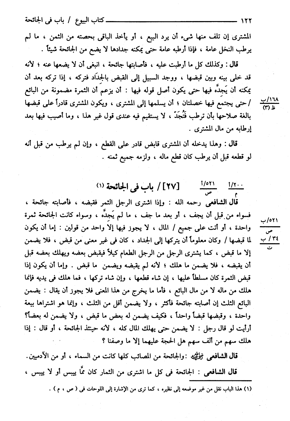 قَالَ الشَّافِعِيُّ : وَإِذَا اشْتَرَى الرَّجُلُ الثَّمَرَ فَقَبَضَهُ فَأَصَابَتْهُ جَائِحَةٌ فَسَوَاءٌ مِنْ قَبْلِ أَنْ يَجِفَّ أَوْ بَعْدَ مَا جَفَّ مَا لَمْ يَجُدَّهُ وَسَوَاءٌ كَانَتْ الْجَائِحَةُ ثَمَرَةً وَاحِدَةً أَوْ أَتَتْ عَلَى جَمِيعِ الْمَالِ لاَ يَجُوزُ فِيهَا إلَّا وَاحِدٌ مِنْ قَوْلَيْنِ : إمَّا أَنْ يَكُونَ لَمَّا قَبَضَهَا وَكَانَ مَعْلُومًا أَنْ يَتْرُكَهَا إلَى الْجِدَادِ كَانَ فِي غَيْرِ مَعْنَى مَنْ قَبَضَ فَلاَ يَضْمَنُ إلَّا مَا قَبَضَ كَمَا يَشْتَرِي الرَّجُلُ مِنْ الرَّجُلِ الطَّعَامَ كَيْلاً فَيَقْبِضُ بَعْضَهُ وَيَهْلَكُ بَعْضُهُ قَبْلَ أَنْ يَقْبِضَهُ فَلاَ يَضْمَنُ مَا هَلَكَ ; لِأَنَّهُ لَمْ يَقْبِضْهُ وَيَضْمَنُ مَا قَبَضَ وَإِمَّا أَنْ يَكُونَ إذَا قَبَضَ الثَّمَرَةَ كَانَ مُسَلَّطًا عَلَيْهَا إنْ شَاءَ قَطَعَهَا , وَإِنْ شَاءَ تَرَكَهَا فَمَا هَلَكَ فِي يَدَيْهِ فَإِنَّمَا هَلَكَ مِنْ مَالِهِ لاَ مِنْ مَالِ الْبَائِعِ فَأَمَّا مَا يَخْرُجُ مِنْ هَذَا الْمَعْنَى فَلاَ يَجُوزُ أَنْ يُقَالَ يَضْمَنُ الْبَائِعُ الثُّلُثَ إنْ أَصَابَتْهُ جَائِحَةٌ فَأَكْثَرَ وَلاَ يَضْمَنُ أَقَلَّ مِنْ الثُّلُثِ وَإِنَّمَا هُوَ اشْتَرَاهَا بَيْعَةً وَاحِدَةً وَقَبَضَهَا قَبْضًا وَاحِدًا فَكَيْفَ يَضْمَنُ لَهُ بَعْضَ مَا قَبَضَ وَلاَ يَضْمَنُ لَهُ بَعْضًا ؟ أَرَأَيْت لَوْ قَالَ رَجُلٌ لاَ يَضْمَنُ حَتَّى يَهْلِكَ الْمَالُ كُلُّهُ ; لِأَنَّهُ حِينَئِذٍ الْجَائِحَةُ أَوْ قَالَ إذَا هَلَكَ سَهْمٌ مِنْ أَلْفِ سَهْمٍ هَلْ الْحُجَّةُ عَلَيْهِمَا إلَّا مَا وَصَفْنَا ؟ .