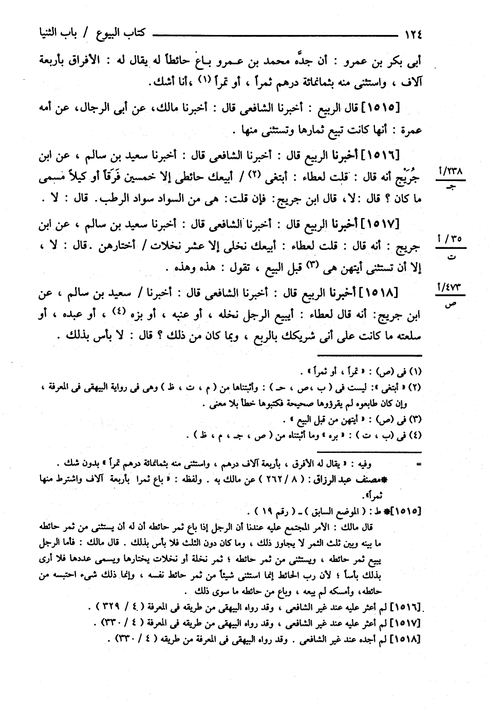 أَبِي بَكْرِ بْنِ عَمْرٍو أَنَّ جَدَّهُ مُحَمَّدَ بْنَ عَمْرٍو بَاعَ حَائِطًا لَهُ يُقَالُ لَهُ الْإِفْرَاقُ بِأَرْبَعَةِ آلاَفٍ وَاسْتَثْنَى مِنْهُ بِثَمَانِمِائَةِ دِرْهَمٍ ثَمَرًا أَوْ تَمْرًا أَنَا أَشُكُّ . ( قَالَ الرَّبِيعُ ) : أَخْبَرَنَا الشَّافِعِيُّ قَالَ أَخْبَرَنَا مَالِكٌ عَنْ أَبِي الرِّجَالِ عَنْ أُمِّهِ عَمْرَةَ أَنَّهَا كَانَتْ تَبِيعُ ثِمَارَهَا وَتَسْتَثْنِي مِنْهَا . ( أَخْبَرَنَا الرَّبِيعُ ) : قَالَ أَخْبَرَنَا الشَّافِعِيُّ قَالَ أَخْبَرَنَا سَعِيدُ بْنُ سَالِمٍ عَنْ ابْنِ جُرَيْجٍ أَنَّهُ قَالَ قُلْت لِعَطَاءٍ أَبِيعُك حَائِطِي إلَّا خَمْسِينَ فَرْقًا أَوْ كَيْلاً مُسَمًّى مَا كَانَ ؟ قَالَ لاَ , قَالَ ابْنُ جُرَيْجٍ فَإِنْ قُلْت هِيَ مِنْ السَّوَادِ سَوَادِ الرُّطَبِ قَالَ لاَ . ( أَخْبَرَنَا الرَّبِيعُ ) : قَالَ أَخْبَرَنَا الشَّافِعِيُّ قَالَ أَخْبَرَنَا سَعِيدُ بْنُ سَالِمٍ عَنْ ابْنِ جُرَيْجٍ أَنَّهُ قَالَ , قُلْت لِعَطَاءٍ أَبِيعُك نَخْلِي إلَّا عَشْرَ نَخَلاَتٍ أَخْتَارُهُنَّ قَالَ لاَ إلَّا أَنْ نَسْتَثْنِيَ أَيَّهنَّ هِيَ قَبْلَ الْبَيْعِ تَقُولُ هَذِهِ وَهَذِهِ . ( أَخْبَرَنَا الرَّبِيعُ ) : قَالَ أَخْبَرَنَا الشَّافِعِيُّ قَالَ أَخْبَرَنَا سَعِيدُ بْنُ سَالِمٍ عَنْ ابْنِ جُرَيْجٍ أَنَّهُ قَالَ لِعَطَاءٍ أَيَبِيعُ الرَّجُلُ نَخْلَهُ أَوْ عِنَبَهُ أَوْ بُرَّهُ أَوْ عَبْدَهُ أَوْ سِلْعَتَهُ مَا كَانَتْ عَلَى أَنِّي شَرِيكُك بِالرُّبْعِ وَبِمَا كَانَ مِنْ ذَلِكَ ؟ قَالَ لاَ بَأْسَ بِذَلِكَ . @