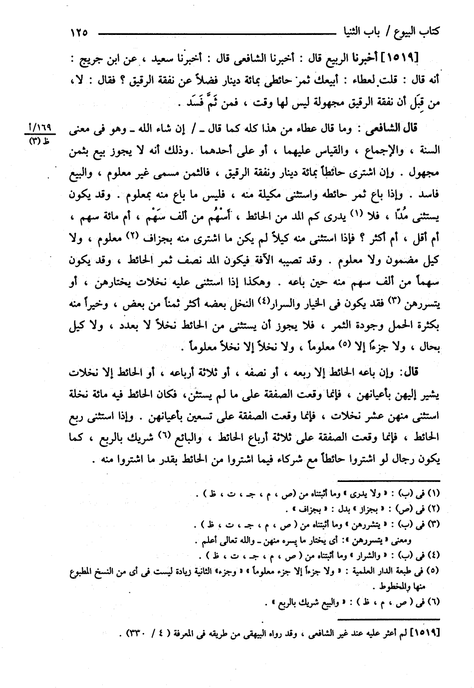 ( أَخْبَرَنَا الرَّبِيعُ ) : قَالَ أَخْبَرَنَا الشَّافِعِيُّ قَالَ أَخْبَرَنَا سَعِيدٌ عَنْ ابْنِ جُرَيْجٍ أَنَّهُ قَالَ قُلْت لِعَطَاءٍ أَبِيعُك ثَمَرَ حَائِطِي بِمِائَةِ دِينَارٍ فَضْلاً عَنْ نَفَقَةِ الرَّقِيقِ ؟ فَقَالَ لاَ مِنْ قِبَلِ أَنَّ نَفَقَةَ الرَّقِيقِ مَجْهُولَةٌ لَيْسَ لَهَا وَقْتٌ فَمِنْ ثَمَّ فَسَدَ .