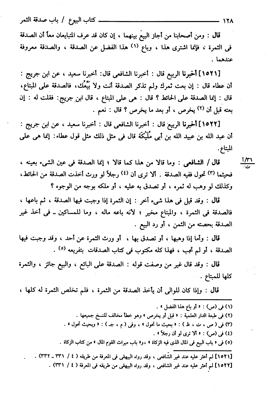 قال: وَمِنْ أَصْحَابِنَا مَنْ أَجَازَ الْبَيْعَ بَيْنَهُمَا , إنْ كَانَ قَدْ عَرَفَ الْمُتَبَايِعَانِ مَعًا أَنَّ الصَّدَقَةَ فِي الثَّمَرَةِ فَإِنَّمَا اشْتَرَى هَذَا وَبَاعَ هَذَا الْفَضْلَ عَنْ الصَّدَقَةِ وَالصَّدَقَةُ مَعْرُوفَةٌ عِنْدَهُمَا. (أَخْبَرَنَا الرَّبِيعُ): قَالَ أَخْبَرَنَا الشَّافِعِيُّ قَالَ أَخْبَرَنَا سَعِيدٌ عَنْ ابْنِ جُرَيْجٍ أَنَّ عَطَاءً قَالَ إنْ بِعْت ثَمَرَك وَلَمْ تَذْكُرْ الصَّدَقَةَ أَنْتَ وَلاَ بَيْعَك فَالصَّدَقَةُ عَلَى الْمُبْتَاعِ قَالَ إنَّمَا الصَّدَقَةُ عَلَى الْحَائِطِ قَالَ هِيَ عَلَى الْمُبْتَاعِ قَالَ ابْنُ جُرَيْجٍ فَقُلْت لَهُ: إنْ بِعْتَهُ قَبْلَ أَنْ يُخْرَصَ أَوْ بَعْدَمَا يُخْرَصُ؟ قَالَ نَعَمْ. (أَخْبَرَنَا الرَّبِيعُ): قَالَ أَخْبَرَنَا الشَّافِعِيُّ قَالَ أَخْبَرَنَا سَعِيدٌ عَنْ ابْنِ جُرَيْجٍ أَنْ عَبْدَ اللَّهِ بْنَ عُبَيْدِ اللَّهِ بْنِ أَبِي مُلَيْكَةَ قَالَ فِي مِثْلِ ذَلِكَ مِثْلَ قَوْلِ عَطَاءٍ إنَّمَا هِيَ عَلَى الْمُبْتَاعِ.