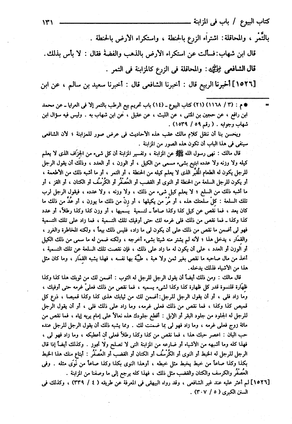 قَالَ الشَّافِعِيُّ : وَالْمُحَاقَلَةُ فِي الزَّرْعِ كَالْمُزَابَنَةِ فِي التَّمْرِ . ( أَخْبَرَنَا الرَّبِيعُ ) : قَالَ أَخْبَرَنَا الشَّافِعِيُّ قَالَ أَخْبَرَنَا سَعِيدُ بْنُ سَالِمٍ عَنْ ابْنِ@