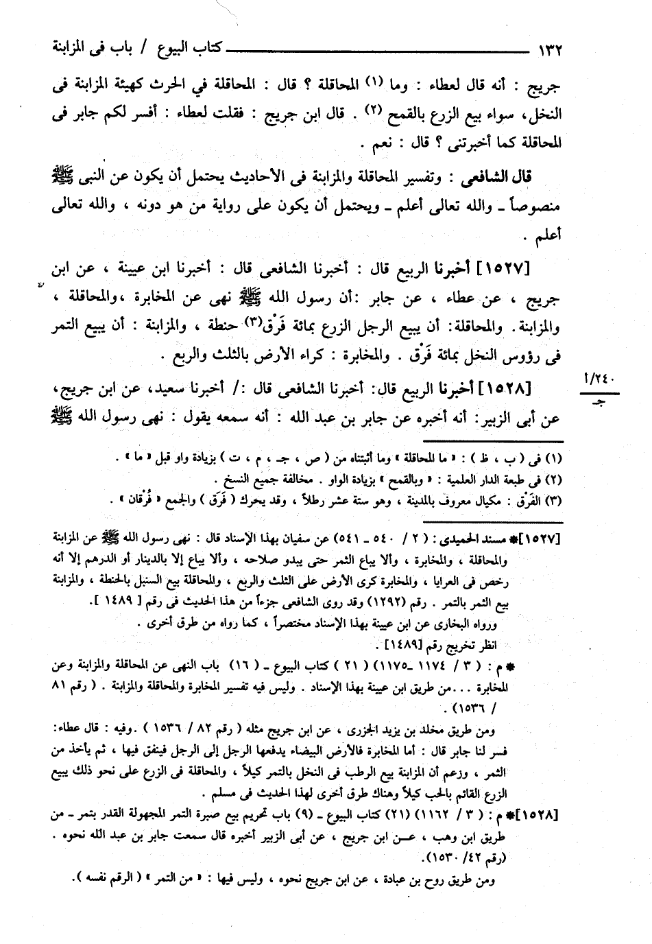جُرَيْجٍ أَنَّهُ قَالَ لِعَطَاءٍ مَا الْمُحَاقَلَةُ قَالَ الْمُحَاقَلَةُ فِي الْحَرْثِ كَهَيْئَةِ الْمُزَابَنَةِ فِي النَّخْلِ سَوَاءٌ بِيعَ الزَّرْعُ وَبِالْقَمْحِ قَالَ ابْنُ جُرَيْجٍ فَقُلْت لِعَطَاءٍ أَفَسَّرَ لَكُمْ جَابِرٌ فِي الْمُحَاقَلَةِ كَمَا أَخْبَرْتنِي قَالَ نَعَمْ . قَالَ الشَّافِعِيُّ وَتَفْسِيرُ الْمُحَاقَلَةِ وَالْمُزَابَنَةِ فِي الْأَحَادِيثِ يُحْتَمَلُ أَنْ يَكُونَ عَنْ النَّبِيِّ - صلى الله عليه وسلم - مَنْصُوصًا وَاَللَّهُ تَعَالَى أَعْلَمُ وَيُحْتَمَلُ أَنْ يَكُونَ عَلَى رِوَايَةِ مَنْ هُوَ دُونَهُ وَاَللَّهُ تَعَالَى أَعْلَمُ . أَخْبَرَنَا الرَّبِيعُ قَالَ أَخْبَرَنَا الشَّافِعِيُّ قَالَ أَخْبَرَنَا ابْنُ عُيَيْنَةَ عَنْ ابْنِ جُرَيْجٍ عَنْ عَطَاءٍ عَنْ جَابِرٍ { أَنَّ رَسُولَ اللَّهِ - صلى الله عليه وسلم - نَهَى عَنْ الْمُخَابَرَةِ وَالْمُحَاقَلَةِ وَالْمُزَابَنَةِ } وَالْمُحَاقَلَةُ أَنْ يَبِيعَ الرَّجُلُ الزَّرْعَ بِمِائَةِ فَرْقِ حِنْطَةٍ وَالْمُزَابَنَةُ أَنْ يَبِيعَ التَّمْرَ فِي رُءُوسِ النَّخْلِ بِمِائَةِ فَرْقٍ وَالْمُخَابَرَةُ كِرَاءُ الْأَرْضِ بِالثُّلُثِ وَالرُّبْعِ . أَخْبَرَنَا الرَّبِيعُ قَالَ أَخْبَرَنَا الشَّافِعِيُّ قَالَ أَخْبَرَنَا سَعِيدٌ عَنْ ابْنِ جُرَيْجٍ عَنْ أَبِي الزُّبَيْرِ أَنَّهُ أَخْبَرَهُ عَنْ جَابِرِ بْنِ عَبْدِ اللَّهِ أَنَّهُ سَمِعَهُ يَقُولُ { نَهَى رَسُولُ اللَّهِ - صلى الله عليه وسلم -@