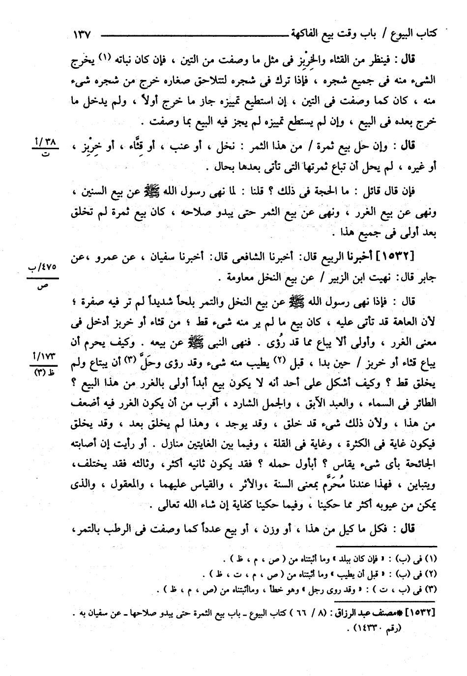 قَالَ فَيُنْظَرُ مِنْ الْقِثَّاءِ وَالْخِرْبِزِ فِي مِثْلِ مَا وَصَفْت مِنْ التِّينِ فَإِنْ كَانَ بِبَلَدٍ يَخْرُجُ الشَّيْءُ مِنْهُ فِي جَمِيعِ شَجَرِهِ فَإِذَا تُرِكَ فِي شَجَرِهِ لِتَتَلاَحَقَ صِغَارُهُ خَرَجَ مِنْ شَجَرِهِ شَيْءٌ مِنْهُ كَانَ كَمَا وَصَفْت فِي التِّينِ إنْ اُسْتُطِيعَ تَمْيِيزُهُ جَازَ مَا خَرَجَ أَوَّلاً وَلَمْ يَدْخُلْ مَا خَرَجَ بَعْدَهُ فِي الْبَيْعِ , وَإِنْ لَمْ يَسْتَطِعْ تَمْيِيزَهُ لَمْ يَجُزْ فِيهِ الْبَيْعُ بِمَا وَصَفْت قَالَ , وَإِنْ حَلَّ بَيْعُ ثَمَرَةٍ مِنْ هَذَا الثَّمَرِ نَخْلٍ أَوْ عِنَبٍ أَوْ قِثَّاءٍ أَوْ خِرْبِزٍ أَوْ غَيْرِهِ لَمْ يَحِلَّ أَنْ تُبَاعَ ثَمَرَتُهَا الَّتِي تَأْتِي بَعْدَهَا بِحَالٍ فَإِنْ قَالَ قَائِلٌ : مَا الْحُجَّةُ فِي ذَلِكَ ؟ قُلْنَا لَمَّا { نَهَى رَسُولُ اللَّهِ - صلى الله عليه وسلم - عَنْ بَيْعِ السِّنِينَ وَنَهَى عَنْ بَيْعِ الْغَرَرِ وَنَهَى عَنْ بَيْعِ الثَّمَرِ حَتَّى يَبْدُوَ صَلاَحُهُ } كَانَ بَيْعُ ثَمَرَةٍ لَمْ تُخْلَقْ بَعْدُ أَوْلَى فِي جَمِيعِ هَذَا . ( أَخْبَرَنَا الرَّبِيعُ ) : قَالَ أَخْبَرَنَا الشَّافِعِيُّ قَالَ أَخْبَرَنَا سُفْيَانُ عَنْ عَمْرٍو عَنْ جَابِرٍ قَالَ نَهَيْت ابْنَ الزُّبَيْرِ عَنْ بَيْعِ النَّخْلِ مُعَاوَمَةً , قَالَ فَإِذَا { نَهَى رَسُولُ اللَّهِ - صلى الله عليه وسلم - عَنْ بَيْعِ النَّخْلِ وَالتَّمْرِ بَلَحًا شَدِيدًا لَمْ تُرَ فِيهِ صُفْرَةٌ } ; لِأَنَّ الْعَاهَةَ قَدْ تَأْتِي عَلَيْهِ كَانَ بَيْعُ مَا لَمْ يُرَ مِنْهُ شَيْءٌ قَطُّ مِنْ قِثَّاءٍ أَوْ خِرْبِزٍ أُدْخِلَ فِي مَعْنَى الْغَرَرِ , وَأَوْلَى أَنْ لاَ يُبَاعَ مِمَّا قَدْ رُئِيَ فَنَهَى النَّبِيُّ - صلى الله عليه وسلم - عَنْ بَيْعِهِ وَكَيْفَ يَحْرُمُ أَنْ يُبَاعَ قِثَّاءٌ أَوْ خِرْبِزٌ حِينَ بَدَا قَبْلَ أَنْ يَطِيبَ مِنْهُ شَيْءٌ وَقَدْ رَوَى رَجُلٌ أَنْ يُبْتَاعَ وَلَمْ يُخْلَقْ قَطُّ ؟ وَكَيْفَ أُشْكِلَ عَلَى أَحَدٍ أَنَّهُ لاَ يَكُونُ بَيْعٌ أَبَدًا أَوْلَى بِالْغَرَرِ مِنْ هَذَا الْبَيْعِ ؟ الطَّائِرُ فِي السَّمَاءِ , وَالْعَبْدُ الْآبِقُ , وَالْجَمَلُ الشَّارِدُ , أَقْرَبُ مِنْ أَنْ يَكُونَ الْغَرَرُ فِيهِ أَضْعَفُ مِنْ هَذَا ; وَلِأَنَّ ذَلِكَ شَيْءٌ قَدْ خُلِقَ وَقَدْ يُوجَدُ وَهَذَا لَمْ يُخْلَقْ بَعْدُ . وَقَدْ يُخْلَقُ فَيَكُونُ غَايَةً فِي الْكَثْرَةِ , وَغَايَةً فِي الْقِلَّةِ وَفِيمَا بَيْنَ الْغَايَتَيْنِ مَنَازِلُ . أَوْ رَأَيْت إنْ أَصَابَتْهُ الْجَائِحَةُ بِأَيِّ شَيْءٍ يُقَاسُ ؟ أَبِأَوَّلِ حِمْلِهِ فَقَدْ يَكُونُ ثَانِيهِ أَكْثَرَ وَثَالِثُهُ فَقَدْ يَخْتَلِفُ وَيَتَبَايَنُ فَهَذَا عِنْدَنَا مُحَرَّمٌ بِمَعْنَى السُّنَّةِ وَالْأَثَرِ وَالْقِيَاسِ عَلَيْهِمَا وَالْمَعْقُولِ , وَاَلَّذِي يُمْكِنُ مِنْ عُيُوبِهِ أَكْثَرُ مِمَّا حَكَيْنَا وَفِيمَا حَكَيْنَا كِفَايَةٌ إنْ شَاءَ اللَّهُ تَعَالَى ..