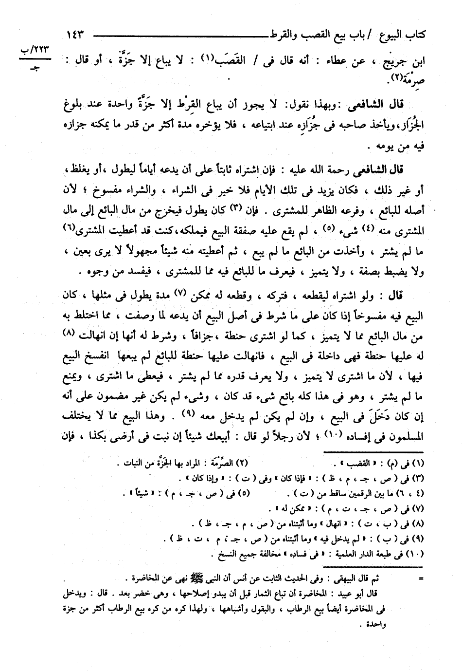 قَالَ الشَّافِعِيُّ : وَبِهَذَا نَقُولُ , لاَ يَجُوزُ أَنْ يُبَاعَ الْقُرْطُ إلَّا جِزَّةً وَاحِدَةً عِنْدَ بُلُوغِ الْجِزَازِ وَيَأْخُذُ صَاحِبُهُ فِي جِزَازِهِ عِنْدَ ابْتِيَاعِهِ فَلاَ يُؤَخِّرُهُ مُدَّةً أَكْثَرَ مِنْ قَدْرِ مَا يُمْكِنُهُ جِزَازُهُ فِيهِ مِنْ يَوْمِهِ .
