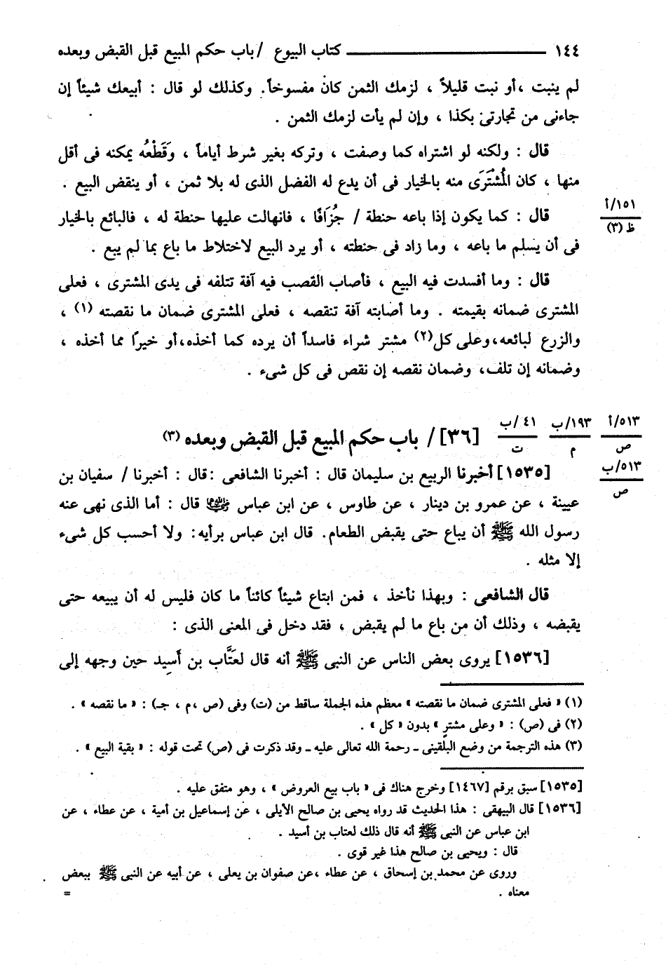 بَابُ حُكْمِ الْمَبِيعِ قَبْلَ الْقَبْضِ وَبَعْدَهُ ( أَخْبَرَنَا الرَّبِيعُ بْنُ سُلَيْمَانَ ) : قَالَ أَخْبَرَنَا الشَّافِعِيُّ قَالَ أَخْبَرَنَا سُفْيَانُ بْنُ عُيَيْنَةَ عَنْ عَمْرِو بْنِ دِينَارٍ عَنْ طَاوُسٍ عَنْ ابْنِ عَبَّاسٍ رضي الله عنهما قَالَ أَمَّا { الَّذِي نَهَى عَنْهُ رَسُولُ اللَّهِ - صلى الله عليه وسلم - أَنْ يُبَاعَ حَتَّى يُقْبَضَ : الطَّعَامُ } قَالَ ابْنُ عَبَّاسٍ بِرَأْيِهِ وَلاَ أَحْسِبُ كُلَّ شَيْءٍ إلَّا مِثْلَهُ .