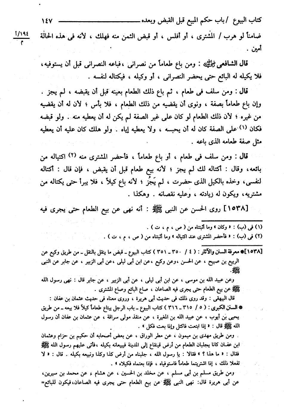 قَالَ الشَّافِعِيُّ : وَمَنْ بَاعَ طَعَامًا مِنْ نَصْرَانِيٍّ فَبَاعَهُ النَّصْرَانِيُّ قَبْلَ أَنْ يَسْتَوْفِيَهُ فَلاَ يَكِيلُهُ لَهُ الْبَائِعُ حَتَّى يَحْضُرَ النَّصْرَانِيُّ أَوْ وَكِيلُهُ فَيَكْتَالُهُ لِنَفْسِهِ .