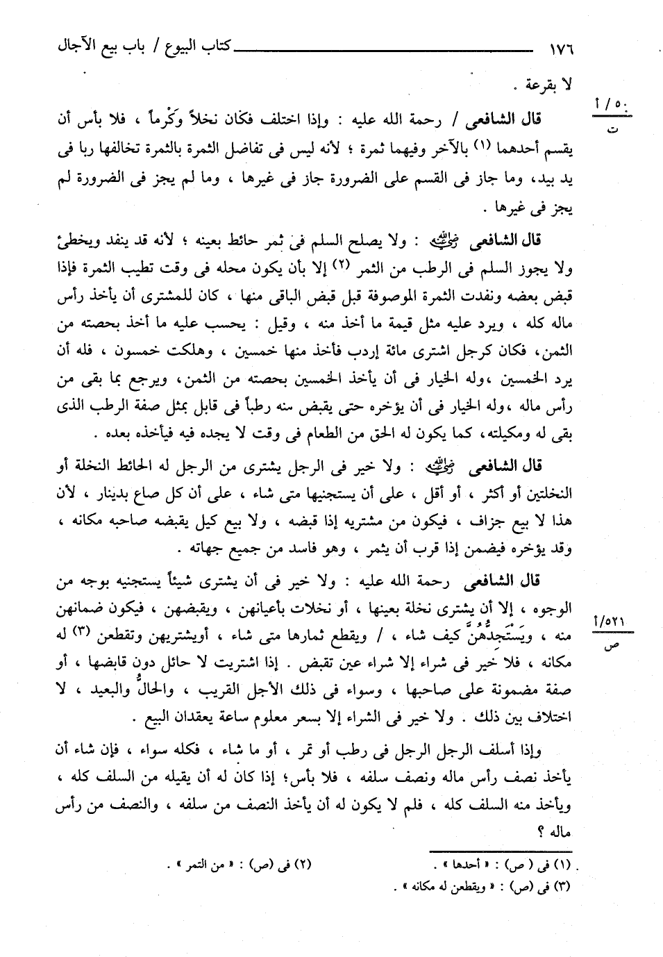 قَالَ الشَّافِعِيُّ : وَلاَ يَصْلُحُ السَّلَمُ فِي ثَمَرِ حَائِطٍ بِعَيْنِهِ ; لِأَنَّهُ قَدْ يَنْفُذُ وَيُخْطِئُ وَلاَ يَجُوزُ السَّلَمُ فِي الرُّطَبِ مِنْ الثَّمَرِ إلَّا بِأَنْ يَكُونَ مَحَلُّهُ فِي وَقْتِ تَطِيب الثَّمَرَةِ فَإِذَا قَبَضَ بَعْضَهُ وَنَفِدَتْ الثَّمَرَةُ الْمَوْصُوفَةُ قَبْلَ قَبْضِ الْبَاقِي مِنْهَا كَانَ لِلْمُشْتَرِي أَنْ يَأْخُذَ رَأْسَ مَالِهِ كُلَّهُ وَيَرُدَّ عَلَيْهِ مِثْلَ قِيمَةِ مَا أُخِذَ مِنْهُ , وَقِيلَ يُحْسَبُ عَلَيْهِ مَا أُخِذَ بِحِصَّتِهِ مِنْ الثَّمَنِ فَكَانَ كَرَجُلٍ اشْتَرَى مِائَةَ إرْدَبٍّ فَأَخَذَ مِنْهَا خَمْسِينَ وَهَلَكَتْ خَمْسُونَ فَلَهُ أَنْ يَرُدَّ الْخَمْسِينَ وَلَهُ الْخِيَارُ فِي أَنْ يَأْخُذَ الْخَمْسِينَ بِحِصَّتِهِ مِنْ الثَّمَنِ وَيَرْجِعَ بِمَا بَقِيَ مِنْ رَأْسِ مَالِهِ وَلَهُ الْخِيَارُ فِي أَنْ يُؤَخِّرَهُ حَتَّى يَقْبِضَ مِنْهُ رُطَبًا فِي قَابِلٍ بِمِثْلِ صِفَةِ الرُّطَبِ الَّذِي بَقِيَ لَهُ وَمَكِيلَتِهِ كَمَا يَكُونُ لَهُ الْحَقُّ مِنْ الطَّعَامِ فِي وَقْتٍ لاَ يَجِدُهُ فِيهِ فَيَأْخُذُهُ بَعْدَهُ .