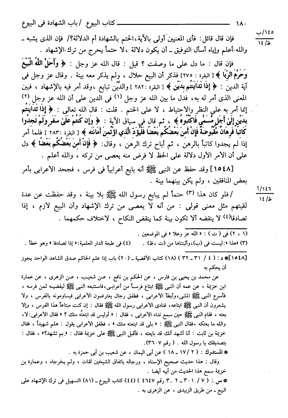 فَإِنْ قَالَ قَائِلٌ فَأَيُّ الْمَعْنَيَيْنِ أَوْلَى بِالآيَةِ الْحَتْمُ بِالشَّهَادَةِ أَمْ الدَّلاَلَةُ ؟ فَإِنَّ الَّذِي يُشْبِهُ وَاَللَّهُ أَعْلَمُ وَإِيَّاهُ أَسْأَلُ التَّوْفِيقَ أَنْ يَكُونَ دَلاَلَةً لاَ حَتْمًا يَخْرُجُ مَنْ تَرَكَ الْإِشْهَادَ فَإِنْ قَالَ مَا دَلَّ عَلَى مَا وَصَفْت ؟ قِيلَ : قَالَ اللَّهُ عَزَّ وَجَلَّ وَأَحَلَّ اللَّهُ الْبَيْعَ وَحَرَّمَ الرِّبَا فَذَكَرَ أَنَّ الْبَيْعَ حَلاَلٌ وَلَمْ يَذْكُرْ مَعَهُ بَيِّنَةً وَقَالَ عَزَّ وَجَلَّ فِي آيَةِ الدَّيْنِ { إذَا تَدَايَنْتُمْ بِدَيْنٍ } وَالدَّيْنُ تَبَايُعٌ وَقَدْ أَمَرَ فِيهِ بِالْإِشْهَادِ فَبَيَّنَ الْمَعْنَى الَّذِي أَمَرَ لَهُ بِهِ فَدَلَّ مَا بَيَّنَ اللَّهُ عَزَّ وَجَلَّ فِي الدَّيْنِ عَلَى أَنَّ اللَّهَ عَزَّ وَجَلَّ إنَّمَا أَمَرَ بِهِ عَلَى النَّظَرِ وَالِاحْتِيَاطِ لاَ عَلَى الْحَتْمِ قُلْت قَالَ اللَّهُ تَعَالَى { إذَا تَدَايَنْتُمْ بِدَيْنٍ إلَى أَجَلٍ مُسَمًّى فَاكْتُبُوهُ } ثُمَّ قَالَ فِي سِيَاقِ الآيَةِ { , وَإِنْ كُنْتُمْ عَلَى سَفَرٍ وَلَمْ تَجِدُوا كَاتِبًا فَرِهَانٌ مَقْبُوضَةٌ فَإِنْ أَمِنَ بَعْضُكُمْ بَعْضًا فَلْيُؤَدِّ الَّذِي ائْتُمِنَ أَمَانَتَهُ } فَلَمَّا أَمَرَ إذَا لَمْ يَجِدُوا كَاتِبًا بِالرَّهْنِ ثُمَّ أَبَاحَ تَرْكَ الرَّهْنِ وَقَالَ { فَإِنْ أَمِنَ بَعْضُكُمْ بَعْضًا } دَلَّ عَلَى أَنَّ الْأَمْرَ الْأَوَّلَ دَلاَلَةٌ عَلَى الْحَضِّ لاَ فَرْضٌ مِنْهُ يَعْصِي مَنْ تَرَكَهُ وَاَللَّهُ أَعْلَمُ . وَقَدْ حُفِظَ { عَنْ النَّبِيِّ - صلى الله عليه وسلم - أَنَّهُ بَايَعَ أَعْرَابِيًّا فِي فَرَسٍ فَجَحَدَ الْأَعْرَابِيُّ بِأَمْرِ بَعْضِ الْمُنَافِقِينَ وَلَمْ يَكُنْ بَيْنَهُمَا بَيِّنَةٌ } فَلَوْ كَانَ حَتْمًا لَمْ يُبَايِعْ رَسُولُ اللَّهِ - صلى الله عليه وسلم - بِلاَ بَيِّنَةٍ وَقَدْ حُفِظَتْ عَنْ عِدَّةٍ لَقِيتهمْ مِثْلَ مَعْنَى قَوْلِي مِنْ أَنَّهُ لاَ يَعْصِي مَنْ تَرَكَ الْإِشْهَادَ وَأَنَّ الْبَيْعَ لاَزِمٌ , إذَا تَصَادَقَا لاَ يُنْقِضُهُ أَنْ لاَ تَكُونَ بَيِّنَةٌ كَمَا يُنْقَضُ النِّكَاحُ , لِاخْتِلاَفِ حُكْمِهِمَا .@
