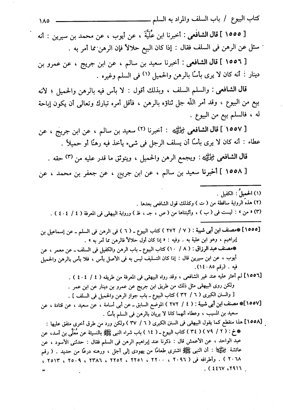 قَالَ الشَّافِعِيُّ : وَالسَّلَمُ السَّلَفُ وَبِذَلِكَ أَقُولُ لاَ بَأْسَ فِيهِ بِالرَّهْنِ وَالْحَمِيلِ لِأَنَّهُ بَيْعٌ مِنْ الْبُيُوعِ وَقَدْ أَمَرَ اللَّهُ جَلَّ ثَنَاؤُهُ بِالرَّهْنِ فَأَقَلُّ أَمْرِهِ تَبَارَكَ وَتَعَالَى أَنْ يَكُونَ إبَاحَةً لَهُ فَالسَّلَمُ بَيْعٌ مِنْ الْبُيُوعِ