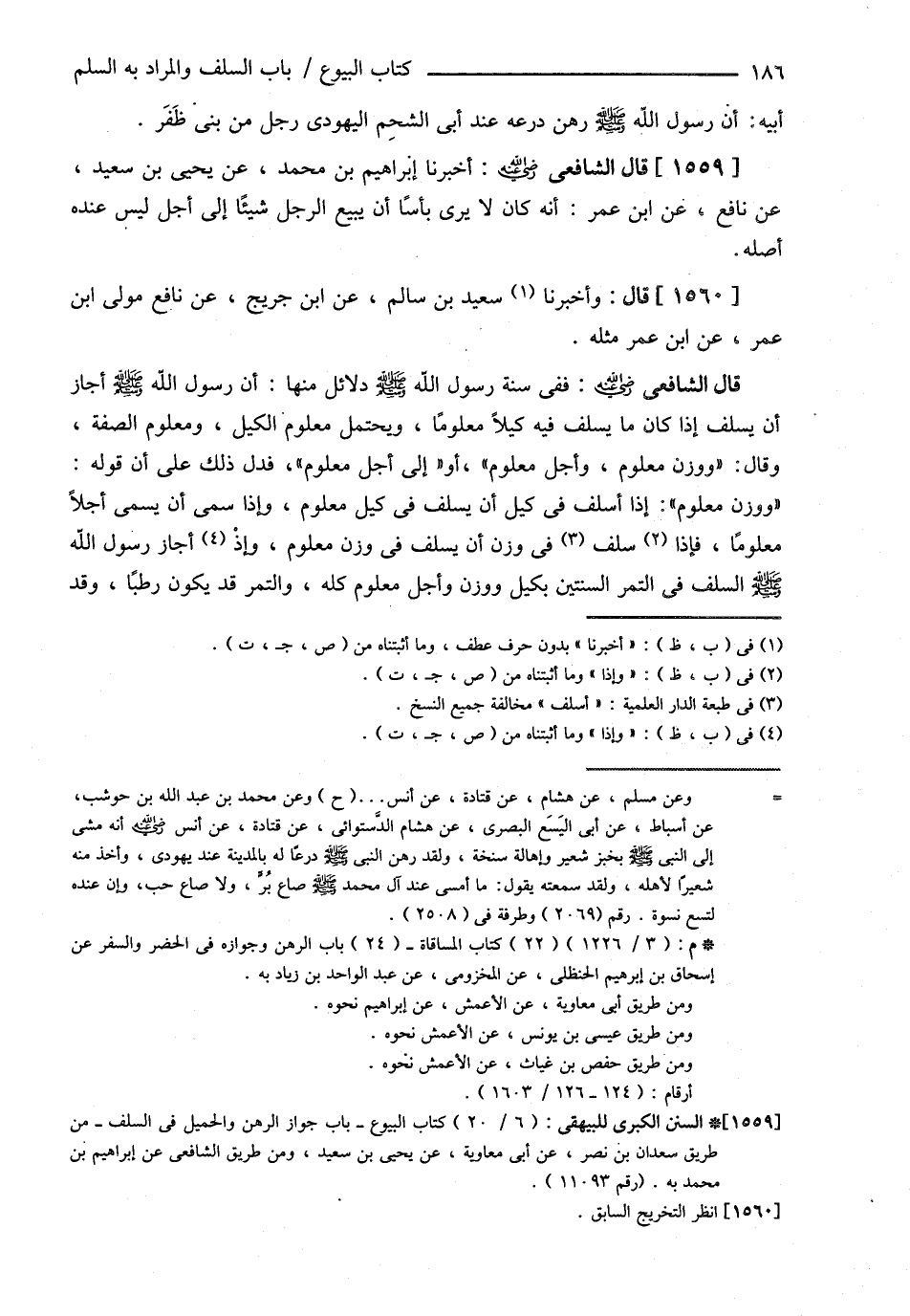 قَالَ الشَّافِعِيُّ : فَفِي سُنَّةِ رَسُولِ اللَّهِ - صلى الله عليه وسلم - دَلاَئِلُ , مِنْهَا { أَنَّ رَسُولَ اللَّهِ - صلى الله عليه وسلم - أَجَازَ أَنْ يُسَلِّفَ إذَا كَانَ مَا يُسَلِّفُ فِيهِ كَيْلاً مَعْلُومًا وَيُحْتَمَلُ مَعْلُومُ الْكَيْلِ وَمَعْلُومُ الصِّفَةِ , وَقَالَ وَوَزْنٌ مَعْلُومٌ وَأَجَلٌ مَعْلُومٌ أَوْ إلَى أَجَلٍ مَعْلُومٍ } فَدَلَّ ذَلِكَ عَلَى أَنَّ قَوْلَهُ وَوَزْنٌ مَعْلُومٌ إذَا أَسْلَفَ فِي كَيْلٍ أَنْ يُسَلِّفَ فِي كَيْلٍ مَعْلُومٍ , وَإِذَا سَمَّى أَنْ يُسَمِّيَ أَجَلاً مَعْلُومًا , وَإِذَا سَلَّفَ فِي وَزْنٍ أَنْ يُسَلِّفَ فِي وَزْنٍ مَعْلُومٍ , وَإِذَا أَجَازَ رَسُولُ اللَّهِ - صلى الله عليه وسلم - السَّلَفَ فِي التَّمْرِ السَّنَتَيْنِ بِكَيْلٍ وَوَزْنٍ وَأَجَلٍ مَعْلُومٍ كُلِّهِ وَالتَّمْرُ قَدْ يَكُونُ رُطَبًا , وَقَدْ@