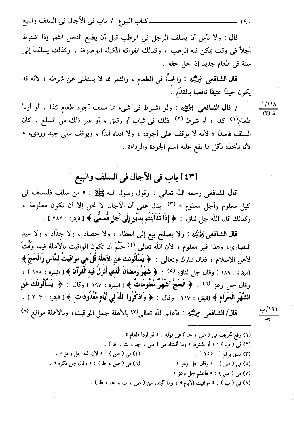 قَالَ الشَّافِعِيُّ : رحمه الله تعالى وَقَوْلُ رَسُولِ اللَّهِ - صلى الله عليه وسلم - { مَنْ سَلَّفَ فَلْيُسَلِّفْ فِي كَيْلٍ مَعْلُومٍ وَأَجَلٍ مَعْلُومٍ } يَدُلُّ عَلَى أَنَّ الْآجَالَ لاَ تَحِلُّ إلَّا أَنْ تَكُونَ مَعْلُومَةً وَكَذَلِكَ قَالَ اللَّهُ جَلَّ ثَنَاؤُهُ { إذَا تَدَايَنْتُمْ بِدَيْنٍ إلَى أَجَلٍ مُسَمًّى }
