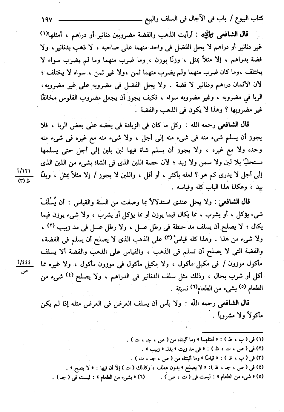 قَالَ الشَّافِعِيُّ : وَلاَ يَحِلُّ عِنْدِي اسْتِدْلاَلاً بِمَا وَصَفْت مِنْ السُّنَّةِ وَالْقِيَاسِ أَنْ يُسَلَّفَ شَيْءٌ يُؤْكَلُ أَوْ يُشْرَبُ مِمَّا يُكَالُ فِيمَا يُوزَنُ مِمَّا يُؤْكَلُ أَوْ يُشْرَبُ , وَلاَ شَيْءٌ يُوزَنُ فِيمَا يُكَالُ لاَ يَصْلُحُ أَنْ يُسَلَّفَ مُدُّ حِنْطَةٍ فِي رَطْلِ عَسَلٍ , وَلاَ رَطْلُ عَسَلٍ فِي مُدِّ زَبِيبٍ , وَلاَ شَيْءٌ مِنْ هَذَا وَهَذَا كُلُّهُ قِيَاسًا عَلَى الذَّهَبِ الَّذِي لاَ يَصْلُحُ أَنْ يُسْلَمَ فِي الْفِضَّةِ , وَالْفِضَّةُ الَّتِي لاَ يَصْلُحُ أَنْ تُسْلَمَ فِي الذَّهَبِ وَالْقِيَاسُ عَلَى الذَّهَبِ وَالْفِضَّةِ أَنْ لاَ يُسَلَّفَ مَأْكُولٌ مَوْزُونٌ فِي مَكِيلٍ مَأْكُولٍ , وَلاَ مَكِيلٌ مَأْكُولٌ فِي مَوْزُونٍ مَأْكُولٍ , وَلاَ غَيْرُهُ مِمَّا أُكِلَ أَوْ شُرِبَ بِحَالٍ وَذَلِكَ مِثْلُ سَلَفِ الدَّنَانِيرِ فِي الدَّرَاهِمِ , وَلاَ يَصْلُحُ شَيْءٌ مِنْ الطَّعَامِ بِشَيْءٍ مِنْ الطَّعَامِ نَسِيئَةً .