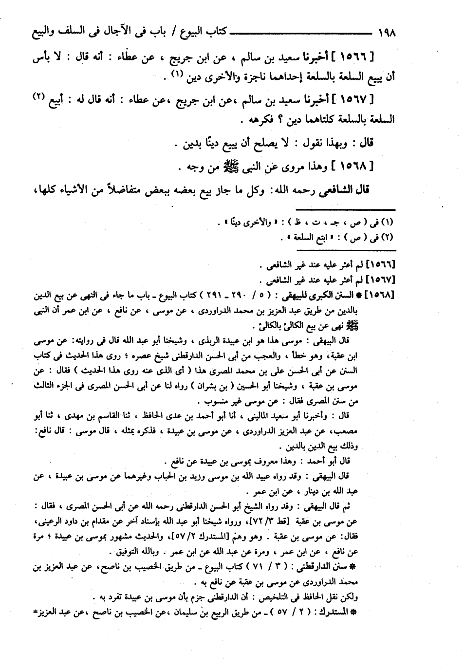 أَخْبَرَنَا سَعِيدُ بْنُ سَالِمٍ عَنْ ابْنِ جُرَيْجٍ عَنْ عَطَاءٍ أَنَّهُ قَالَ لاَ بَأْسَ أَنْ يَبِيعَ السِّلْعَةَ بِالسِّلْعَةِ إحْدَاهُمَا نَاجِزَةٌ وَالْأُخْرَى دَيْنٌ أَخْبَرَنَا سَعِيدُ بْنُ سَالِمٍ عَنْ ابْنِ جُرَيْجٍ عَنْ عَطَاءٍ أَنَّهُ قَالَ لَهُ أَبِيعُ السِّلْعَةَ بِالسِّلْعَةِ كِلْتَاهُمَا دَيْنٌ ؟ فَكَرِهَهُ قَالَ وَبِهَذَا نَقُولُ لاَ يَصْلُحُ أَنْ يَبِيعَ دَيْنًا بِدَيْنٍ وَهَذَا مَرْوِيٌّ عَنْ النَّبِيِّ - صلى الله عليه وسلم - مِنْ وَجْهٍ