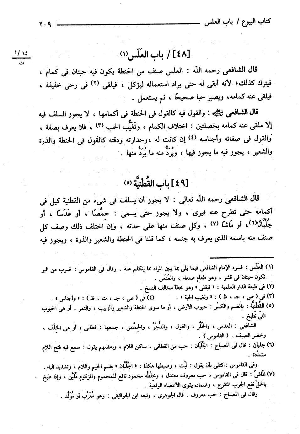 قَالَ الشَّافِعِيُّ : رحمه الله تعالى لاَ يَجُوزُ أَنْ يُسَلِّفَ فِي شَيْءٍ مِنْ الْقُطْنِيَّةِ كَيْلٌ فِي أَكْمَامِهِ حَتَّى تُطْرَحَ فَيُرَى , وَلاَ يَجُوزُ حَتَّى يُسَمَّى حِمَّصًا أَوْ عَدَسًا أَوْ جُلُبَّانًا أَوْ مَاشًا وَكُلُّ صِنْفٍ مِنْهَا عَلَى حِدَتِهِ , وَإِنْ اخْتَلَفَ ذَلِكَ وُصِفَ كُلُّ صِنْفٍ مِنْهُ بِاسْمِهِ الَّذِي يُعْرَفُ بِهِ جِنْسُهُ كَمَا قُلْنَا فِي الْحِنْطَةِ وَالشَّعِيرِ وَالذُّرَةِ وَيَجُوزُ فِيهِ@