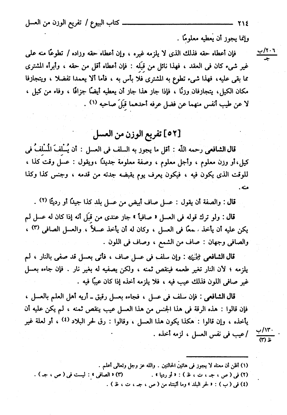 قَالَ الشَّافِعِيُّ : رحمه الله أَقَلُّ مَا يَجُوزُ بِهِ السَّلَفُ فِي الْعَسَلِ أَنْ يُسَلِّفَ الْمُسَلِّفُ فِي كَيْلٍ أَوْ وَزْنٍ مَعْلُومٍ وَأَجَلٍ مَعْلُومٍ وَصِفَةٍ مَعْلُومَةٍ جَدِيدًا وَيَقُولُ عَسَلُ وَقْتِ كَذَا , لِلْوَقْتِ الَّذِي يَكُونُ فِيهِ فَيَكُونُ يَعْرِفُ يَوْمَ يَقْبِضُهُ جِدَّتَهُ مِنْ قِدَمِهِ وَجِنْسَ كَذَا وَكَذَا مِنْهُ.