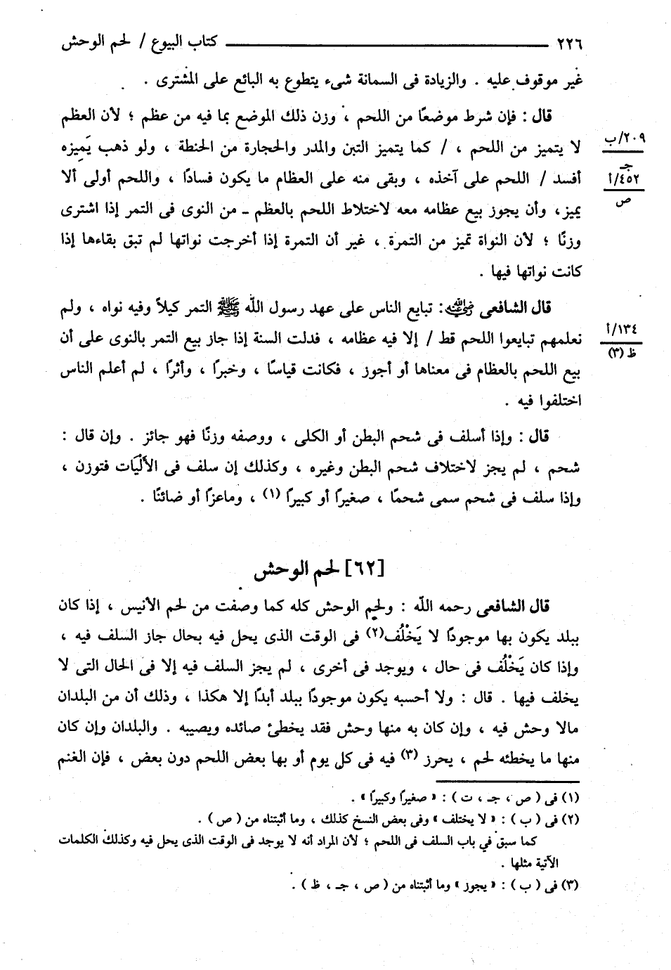قَالَ الشَّافِعِيُّ : رحمه الله : وَلَحْمُ الْوَحْشِ كُلُّهُ كَمَا وَصَفْت مِنْ لَحْمِ الْأَنِيسِ , إذَا كَانَ بِبَلَدٍ يَكُونُ بِهَا مَوْجُودًا لاَ يَخْتَلِفُ فِي الْوَقْتِ الَّذِي يَحِلُّ فِيهِ بِحَالٍ جَازَ السَّلَفُ فِيهِ , وَإِذَا كَانَ يَخْتَلِفُ فِي حَالٍ وَيُوجَدُ فِي أُخْرَى لَمْ يَجُزْ السَّلَفُ فِيهِ إلَّا فِي الْحَالِ الَّتِي لاَ يَخْتَلِفُ فِيهَا قَالَ , وَلاَ أَحْسِبُهُ يَكُونُ مَوْجُودًا بِبَلَدٍ أَبَدًا إلَّا هَكَذَا وَذَلِكَ أَنَّ مِنْ الْبُلْدَانِ مَا لاَ وَحْشَ فِيهِ , وَإِنْ كَانَ بِهِ مِنْهَا وَحْشٌ فَقَدْ يُخْطِئُ صَائِدُهُ وَيُصِيبُهُ وَالْبُلْدَانُ , وَإِنْ كَانَ مِنْهَا مَا يُخْطِئُهُ لَحْمٌ يَجُوزُ فِيهِ فِي كُلِّ يَوْمٍ أَوْ بِهَا بَعْضُ اللَّحْمِ دُونَ بَعْضٍ فَإِنَّ الْغَنَمَ@