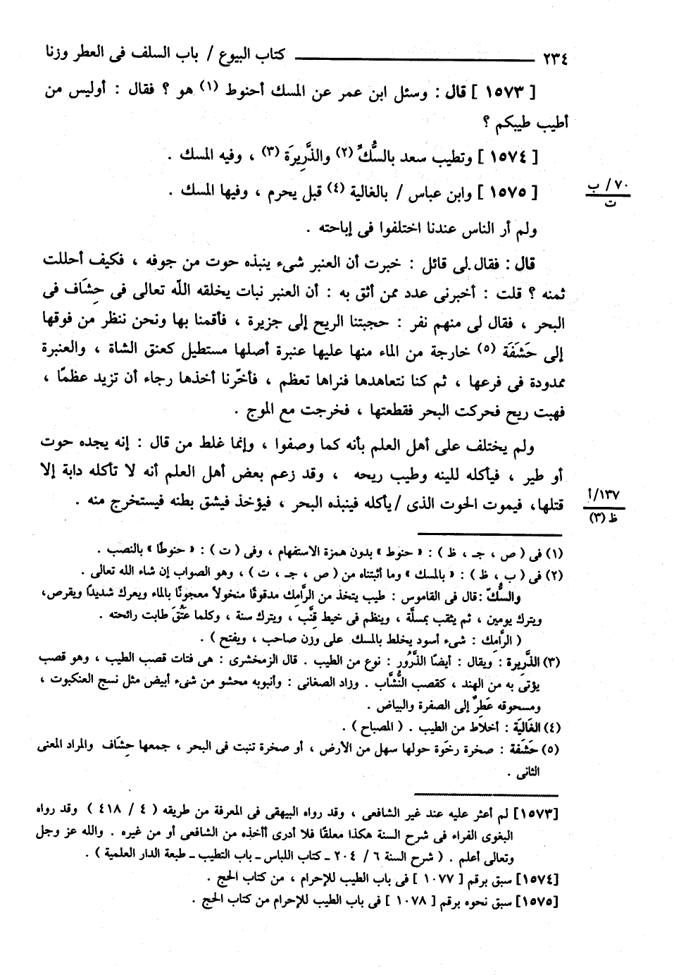 قال : وَسُئِلَ ابْنُ عُمَرَ عَنْ الْمِسْكِ أَحَنُوطٌ هُوَ ؟ فَقَالَ أَوَلَيْسَ مِنْ أَطْيَبِ طِيبِكُمْ ؟ وَتَطَيَّبَ سَعْدٌ بِالْمِسْكِ وَالذَّرِيرَةِ وَفِيهِ الْمِسْكُ وَابْنُ عَبَّاسٍ بِالْغَالِيَةِ قَبْلَ أَنْ يُحْرِمَ وَفِيهَا الْمِسْكُ وَلَمْ أَرَ النَّاسَ عِنْدَنَا اخْتَلَفُوا فِي إبَاحَتِهِ.