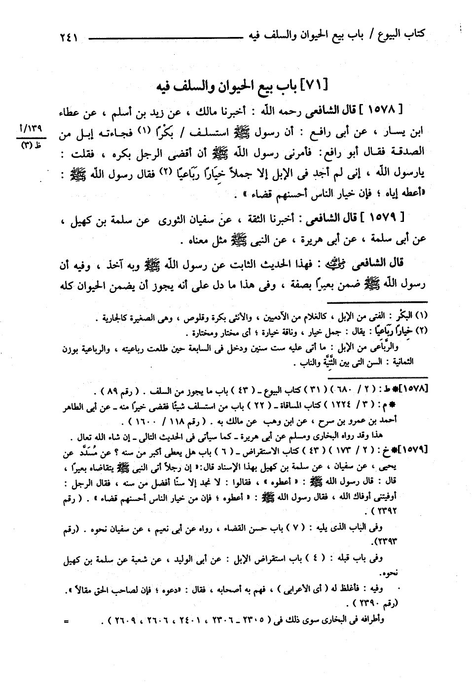 قَالَ الشَّافِعِيُّ : رحمه الله : أَخْبَرَنَا مَالِكٌ عَنْ زَيْدِ بْنِ أَسْلَمَ عَنْ عَطَاءِ بْنِ يَسَارٍ عَنْ أَبِي رَافِعٍ { أَنَّ رَسُولَ اللَّهِ - صلى الله عليه وسلم - اسْتَسْلَفَ بِكْرًا فَجَاءَتْهُ إبِلٌ مِنْ الصَّدَقَةِ فَقَالَ أَبُو رَافِعٍ فَأَمَرَنِي رَسُولُ اللَّهِ - صلى الله عليه وسلم - أَنْ أَقْضِيَ الرَّجُلَ بِكْرَهُ فَقُلْت يَا رَسُولَ اللَّهِ إنِّي لَمْ أَجِدْ فِي الْإِبِلِ إلَّا جَمَلاً خِيَارًا رُبَاعِيًّا فَقَالَ رَسُولُ اللَّهِ - صلى الله عليه وسلم - أَعْطِهِ إيَّاهُ فَإِنَّ خِيَارَ النَّاسِ أَحْسَنُهُمْ قَضَاءً }