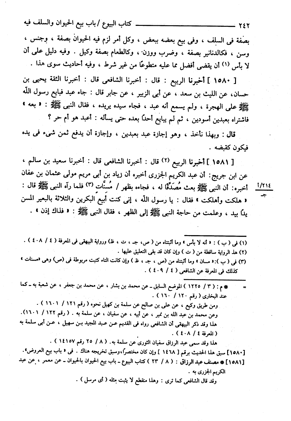 بِصِفَةٍ فِي السَّلَفِ وَفِي بَيْعِ بَعْضِهِ بِبَعْضٍ وَكُلُّ أَمْرٍ لَزِمَ فِيهِ الْحَيَوَانُ بِصِفَةٍ وَجِنْسٍ وَسِنٍّ فَكَالدَّنَانِيرِ بِصِفَةٍ وَضَرْبٍ وَوَزْنٍ وَكَالطَّعَامِ بِصِفَةٍ وَكَيْلٍ وَفِيهِ دَلِيلٌ عَلَى أَنَّهُ لاَ بَأْسَ أَنْ يَقْضِيَ أَفْضَلَ مِمَّا عَلَيْهِ مُتَطَوِّعًا مِنْ غَيْرِ شَرْطٍ وَفِيهِ أَحَادِيثُ سِوَى هَذَا ( أَخْبَرَنَا الرَّبِيعُ ) : قَالَ أَخْبَرَنَا الشَّافِعِيُّ قَالَ أَخْبَرَنَا الثِّقَةُ يَحْيَى بْنُ حَسَّانَ عَنْ اللَّيْثِ بْنِ سَعْدٍ عَنْ أَبِي الزُّبَيْرِ عَنْ جَابِرٍ قَالَ { جَاءَ عَبْدٌ فَبَايَعَ رَسُولَ اللَّهِ - صلى الله عليه وسلم - عَلَى الْهِجْرَةِ وَلَمْ يَسْمَعْ أَنَّهُ عَبْدٌ فَجَاءَ سَيِّدُهُ يُرِيدُهُ فَقَالَ النَّبِيُّ - صلى الله عليه وسلم - بِعْهُ فَاشْتَرَاهُ بِعَبْدَيْنِ أَسْوَدَيْنِ ثُمَّ لَمْ يُبَايِعْ أَحَدًا بَعْدَهُ حَتَّى يَسْأَلَهُ : أَعَبْدٌ هُوَ أَمْ حُرٌّ }.