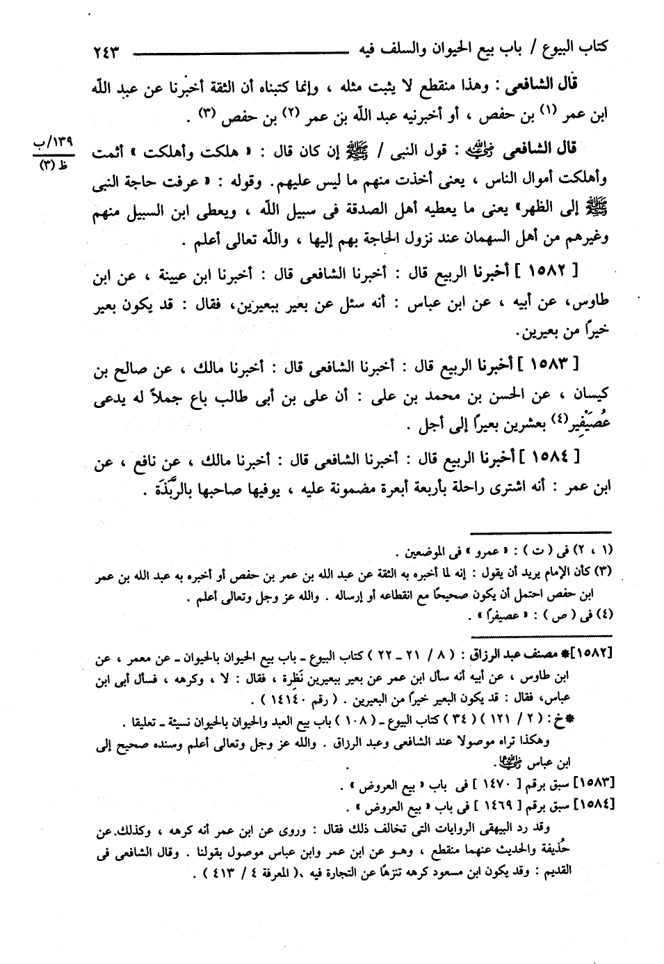 قَالَ الشَّافِعِيُّ : قَوْلُ النَّبِيِّ - صلى الله عليه وسلم - { إنْ كَانَ قَالَ هَلَكْت وَأَهْلَكْت أَثِمْت وَأَهْلَكْت أَمْوَالَ النَّاسِ } يَعْنِي أَخَذْت مِنْهُمْ مَا لَيْسَ عَلَيْهِمْ وَقَوْلُهُ { عَرَفْت حَاجَةَ النَّبِيِّ - صلى الله عليه وسلم - إلَى الظَّهْرِ } يَعْنِي مَا يُعْطِيهِ أَهْلُ الصَّدَقَةِ فِي سَبِيلِ اللَّهِ وَيُعْطَى ابْنُ السَّبِيلِ مِنْهُمْ وَغَيْرُهُمْ مِنْ أَهْلِ السُّهْمَانِ عِنْدَ نُزُولِ الْحَاجَةِ بِهِمْ إلَيْهَا وَاَللَّهُ تَعَالَى أَعْلَمُ . ( أَخْبَرَنَا الرَّبِيعُ ) : قَالَ أَخْبَرَنَا الشَّافِعِيُّ قَالَ أَخْبَرَنَا ابْنُ عُيَيْنَةَ عَنْ ابْنِ طَاوُسٍ عَنْ أَبِيهِ عَنْ ابْنِ عَبَّاسٍ أَنَّهُ سُئِلَ عَنْ بَعِيرٍ بِبَعِيرَيْنِ فَقَالَ قَدْ يَكُونُ بَعِيرٌ خَيْرًا مِنْ بَعِيرَيْنِ . ( أَخْبَرَنَا الرَّبِيعُ ) : قَالَ أَخْبَرَنَا الشَّافِعِيُّ قَالَ أَخْبَرَنَا مَالِكٌ عَنْ صَالِحِ بْنِ كَيْسَانَ عَنْ الْحَسَنِ بْنِ مُحَمَّدِ بْنِ عَلِيٍّ أَنَّ عَلِيَّ بْنَ أَبِي طَالِبٍ بَاعَ جَمَلاً لَهُ يُدْعَى عُصَيْفِير بِعِشْرِينَ بَعِيرًا إلَى أَجَلٍ . ( أَخْبَرَنَا الرَّبِيعُ ) : قَالَ أَخْبَرَنَا الشَّافِعِيُّ قَالَ أَخْبَرَنَا مَالِكٌ عَنْ نَافِعٍ عَنْ ابْنِ عُمَرَ أَنَّهُ اشْتَرَى رَاحِلَةً بِأَرْبَعَةِ أَبْعِرَةٍ مَضْمُونَةٍ عَلَيْهِ يُوَفِّيهَا صَاحِبَهَا بِالرَّبَذَةِ .@