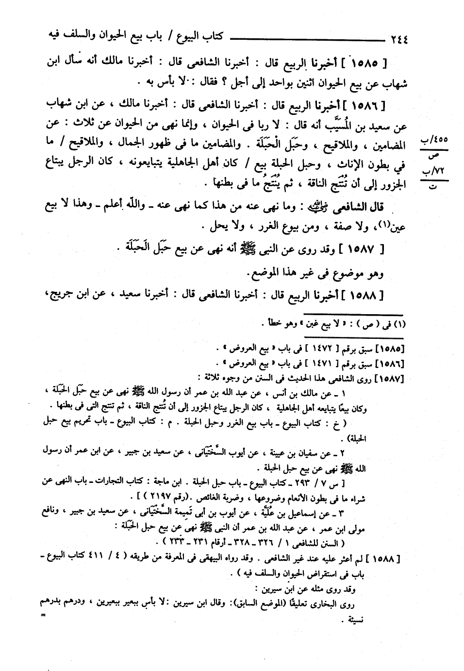 ( أَخْبَرَنَا الرَّبِيعُ ) : قَالَ أَخْبَرَنَا الشَّافِعِيُّ قَالَ أَخْبَرَنَا مَالِكٌ أَنَّهُ سَأَلَ ابْنَ شِهَابٍ عَنْ بَيْعِ الْحَيَوَانِ اثْنَيْنِ بِوَاحِدٍ إلَى أَجَلٍ ؟ فَقَالَ لاَ بَأْسَ بِهِ ( أَخْبَرَنَا الرَّبِيعُ ) : قَالَ أَخْبَرَنَا الشَّافِعِيُّ قَالَ أَخْبَرَنَا مَالِكٌ عَنْ ابْنِ شِهَابٍ عَنْ سَعِيدِ بْنِ الْمُسَيِّبِ أَنَّهُ قَالَ لاَ رِبَا فِي الْحَيَوَانِ وَإِنَّمَا نَهْيٌ مِنْ الْحَيَوَانِ عَنْ ثَلاَثٍ عَنْ الْمَضَامِينِ وَالْمَلاَقِيحِ وَحَبَلِ الْحَبَلَةِ وَالْمَضَامِينُ مَا فِي ظُهُورِ الْجِمَالِ وَالْمَلاَقِيحُ مَا فِي بُطُونِ الْإِنَاثِ وَحَبَلُ الْحَبَلَةِ بَيْعٌ كَانَ أَهْلُ الْجَاهِلِيَّةِ يَتَبَايَعُونَهُ كَانَ الرَّجُلُ يَبْتَاعُ الْجَزُورَ إلَى أَنْ تُنْتَجَ النَّاقَةُ ثُمَّ يُنْتَجُ مَا فِي بَطْنِهَا .