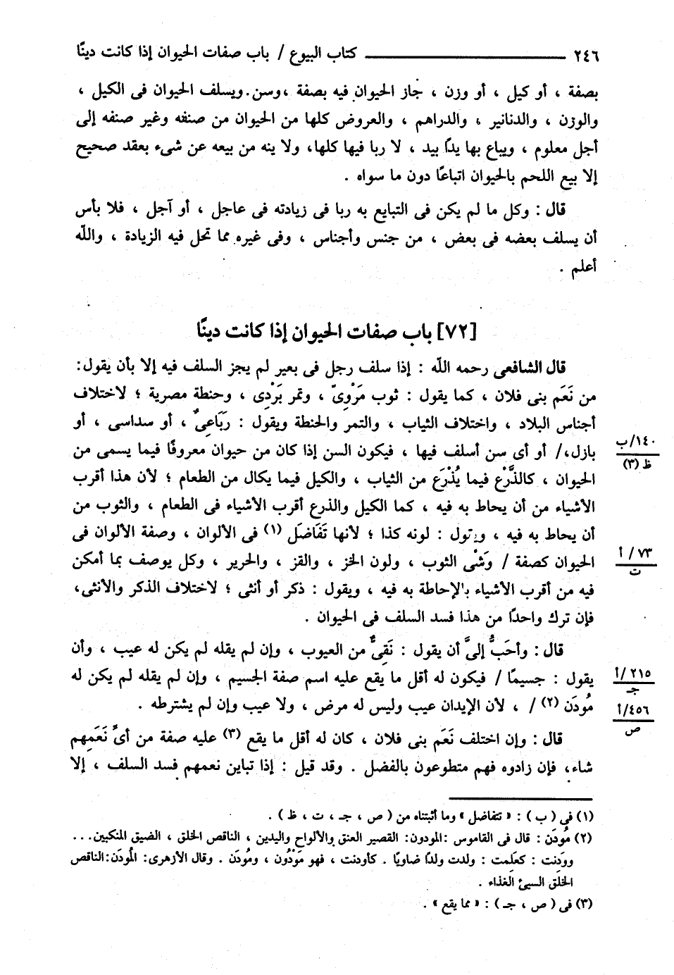 بِصِفَةٍ أَوْ كَيْلٍ أَوْ وَزْنٍ جَازَ الْحَيَوَانُ فِيهِ بِصِفَةٍ وَسِنٍّ وَيُسَلَّفُ الْحَيَوَانُ فِي الْكَيْلِ وَالْوَزْنِ وَالدَّنَانِيرِ وَالدَّرَاهِمِ , وَالْعُرُوضُ كُلُّهَا مِنْ الْحَيَوَانِ مِنْ صِنْفِهِ وَغَيْرِ صِنْفِهِ إلَى أَجَلٍ مَعْلُومٍ وَيُبَاعُ بِهَا يَدًا بِيَدٍ لاَ رِبَا فِيهَا كُلِّهَا , وَلاَ يَنْهَى مِنْ بَيْعِهِ عَنْ شَيْءٍ بِعَقْدٍ صَحِيحٍ إلَّا بَيْعَ اللَّحْمِ بِالْحَيَوَانِ اتِّبَاعًا دُونَ مَا سِوَاهُ ..