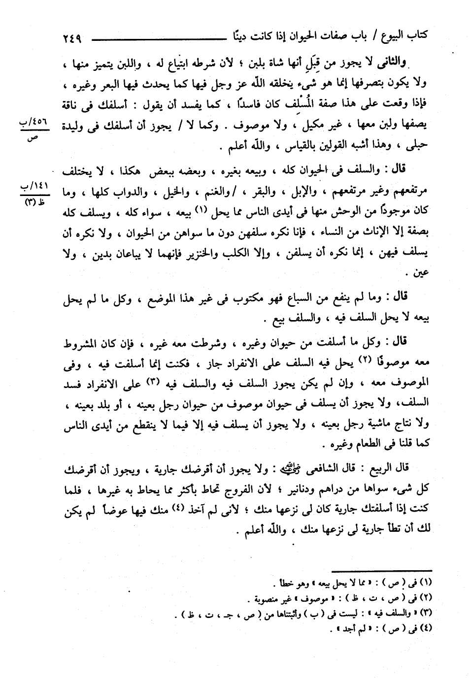 قال : وَالسَّلَفُ فِي الْحَيَوَانِ كُلِّهِ وَبَيْعُهُ بِغَيْرِهِ وَبَعْضُهُ بِبَعْضٍ هَكَذَا لاَ يَخْتَلِفُ مُرْتَفِعُهُمْ وَغَيْرُ مُرْتَفِعِهِمْ وَالْإِبِلُ وَالْبَقَرُ وَالْغَنَمُ وَالْخَيْلُ وَالدَّوَابُّ كُلُّهَا وَمَا كَانَ مَوْجُودًا مِنْ الْوَحْشِ مِنْهَا فِي أَيْدِي النَّاسِ مِمَّا يَحِلُّ بَيْعُهُ سَوَاءٌ كُلُّهُ وَيُسَلَّفُ كُلُّهُ بِصِفَةٍ إلَّا الْإِنَاثَ مِنْ النِّسَاءِ فَإِنَّا نَكْرَهُ سَلَفَهُنَّ دُونَ مَا سِوَاهُنَّ مِنْ الْحَيَوَانِ . وَلاَ نَكْرَهُ أَنْ يُسَلَّفَ فِيهِنَّ إنَّمَا نَكْرَهُ أَنْ يُسَلَّفْنَ وَإِلَّا الْكَلْبَ وَالْخِنْزِيرَ فَإِنَّهُمَا لاَ يُبَاعَانِ بِدَيْنٍ , وَلاَ عَيْنٍ ..