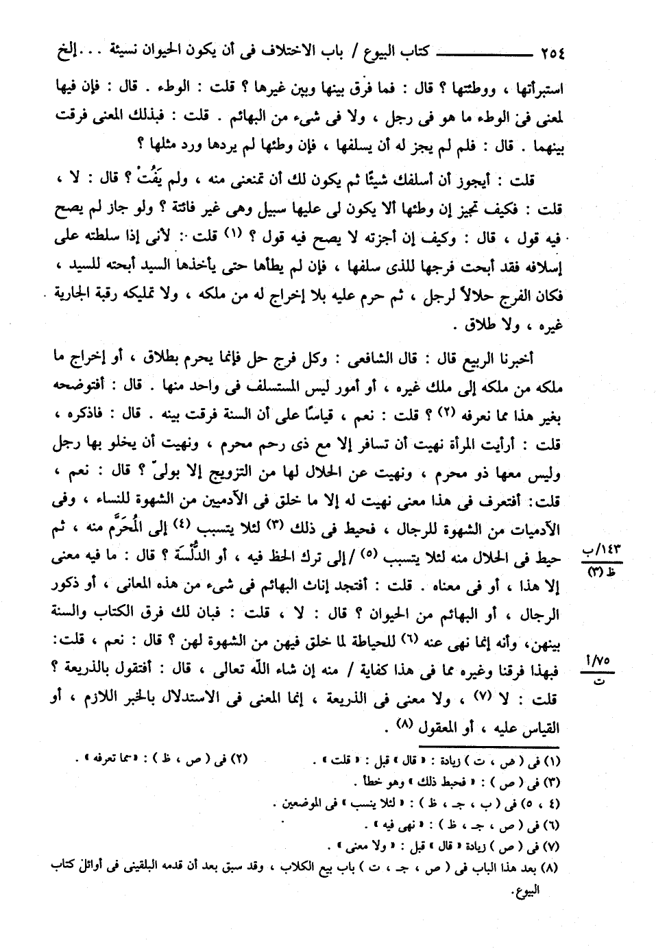 قَالَ الشَّافِعِيُّ : وَكُلُّ فَرْجٍ حَلَّ فَإِنَّمَا يَحْرُمُ بِطَلاَقٍ أَوْ إخْرَاجِ مَا مَلَكَهُ إلَى مِلْكِ غَيْرِهِ أَوْ أُمُورٍ لَيْسَ الْمُسْتَسْلِفُ فِي وَاحِدٍ مِنْهَا قَالَ أَفَتُوَضِّحُهُ بِغَيْرِ هَذَا مِمَّا نَعْرِفُهُ ؟ قُلْت نَعَمْ قِيَاسًا عَلَى أَنَّ السُّنَّةَ فَرَّقَتْ بَيْنَهُ قَالَ فَاذْكُرْهُ قُلْت أَرَأَيْت الْمَرْأَةَ نُهِيَتْ أَنْ تُسَافِرَ إلَّا مَعَ ذِي رَحِمٍ مَحْرَمٍ وَنُهِيَتْ أَنْ يَخْلُوَ بِهَا رَجُلٌ وَلَيْسَ مَعَهَا ذُو مَحْرَمٍ وَنُهِيَتْ عَنْ الْحَلاَلِ لَهَا مِنْ التَّزْوِيجِ إلَّا بِوَلِيٍّ ؟ قَالَ نَعَمْ قُلْت أَفَتَعْرِفُ فِي هَذَا مَعْنَى نُهِيَتْ لَهُ إلَّا مَا خُلِقَ فِي الْآدَمِيِّينَ مِنْ الشَّهْوَةِ لِلنِّسَاءِ وَفِي الْآدَمِيَّاتِ مِنْ الشَّهْوَةِ لِلرِّجَالِ فَحِيطَ فِي ذَلِكَ لِئَلَّا يُنْسَبَ إلَى الْمُحَرَّمِ مِنْهُ , ثُمَّ حِيطَ فِي الْحَلاَلِ مِنْهُ لِئَلَّا يُنْسَبَ إلَى تَرْكِ الْحَظِّ فِيهِ أَوْ الدُّلْسَةِ ؟ قَالَ مَا فِيهِ مَعْنَى إلَّا هَذَا أَوْ فِي مَعْنَاهُ قُلْت أَفَتَجِدُ إنَاثَ الْبَهَائِمِ فِي شَيْءٍ مِنْ هَذِهِ الْمَعَانِي أَوْ ذُكُورَ الرِّجَالِ أَوْ الْبَهَائِمِ مِنْ الْحَيَوَانِ ؟ قَالَ لاَ قُلْت فَبَانَ لَك فَرْقُ الْكِتَابِ وَالسُّنَّةِ بَيْنَهُنَّ وَأَنَّهُ إنَّمَا نُهِيَ عَنْهُ لِلْحِيَاطَةِ لِمَا خُلِقَ فِيهِنَّ مِنْ الشَّهْوَةِ لَهُنَّ ؟ قَالَ نَعَمْ قُلْت فَبِهَذَا فَرَّقْنَا وَغَيْرِهِ مِمَّا فِي هَذَا كِفَايَةٌ مِنْهُ إنْ شَاءَ اللَّهُ تَعَالَى , قَالَ أَفَتَقُولُ بِالذَّرِيعَةِ ؟ قُلْت لاَ , وَلاَ مَعْنَى فِي الذَّرِيعَةِ إنَّمَا الْمَعْنَى فِي الِاسْتِدْلاَلِ بِالْخَبَرِ اللَّازِمِ أَوْ الْقِيَاسِ عَلَيْهِ أَوْ الْمَعْقُولِ .@