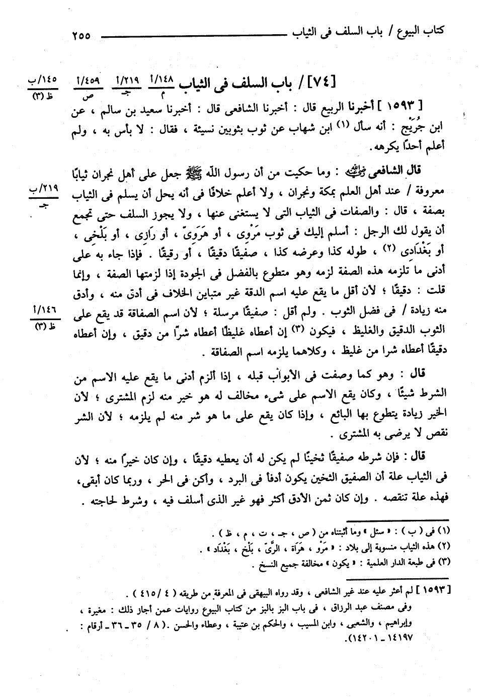 بَابُ السَّلَفِ فِي الثِّيَابِ ( أَخْبَرَنَا الرَّبِيعُ ) : قَالَ أَخْبَرَنَا الشَّافِعِيُّ , قَالَ أَخْبَرَنَا سَعِيدُ بْنُ سَالِمٍ عَنْ ابْنِ جُرَيْجٍ أَنَّهُ سُئِلَ ابْنُ شِهَابٍ عَنْ ثَوْبٍ بِثَوْبَيْنِ نَسِيئَةً فَقَالَ لاَ بَأْسَ بِهِ وَلَمْ أَعْلَمْ أَحَدًا يُكَرِّهُهُ