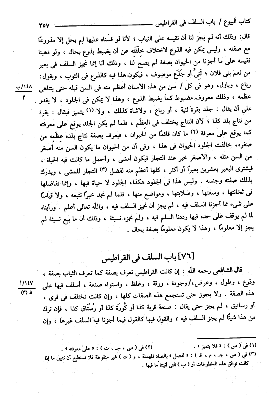 قَالَ الشَّافِعِيُّ : رحمه الله : إنْ كَانَتْ الْقَرَاطِيسُ - تُعْرَفُ بِصِفَةٍ كَمَا تُعْرَفُ الثِّيَابُ بِصِفَةٍ وَذَرْعٍ وَطُولٍ وَعَرْضٍ وَجَوْدَةٍ وَرِقَّةٍ وَغِلَظٍ وَاسْتِوَاءِ صَنْعَةٍ أَسْلَفَ فِيهَا عَلَى هَذِهِ الصِّفَةِ , وَلاَ يَجُوزُ حَتَّى تُسْتَجْمَعَ هَذِهِ الصِّفَاتُ كُلُّهَا , وَإِنْ كَانَتْ تَخْتَلِفُ فِي قُرًى أَوْ رَسَاتِيقَ لَمْ يَجُزْ حَتَّى يُقَالَ صَنْعَةُ قَرْيَةِ كَذَا أَوْ كُورَةِ كَذَا أَوْ رُسْتَاقِ كَذَا فَإِنْ تَرَكَ مِنْ هَذَا شَيْئًا لَمْ يَجُزْ السَّلَفُ فِيهِ وَالْقَوْلُ فِيهَا كَالْقَوْلِ فِيمَا أَجَزْنَا فِيهِ السَّلَفَ غَيْرُهَا , وَإِنْ .@