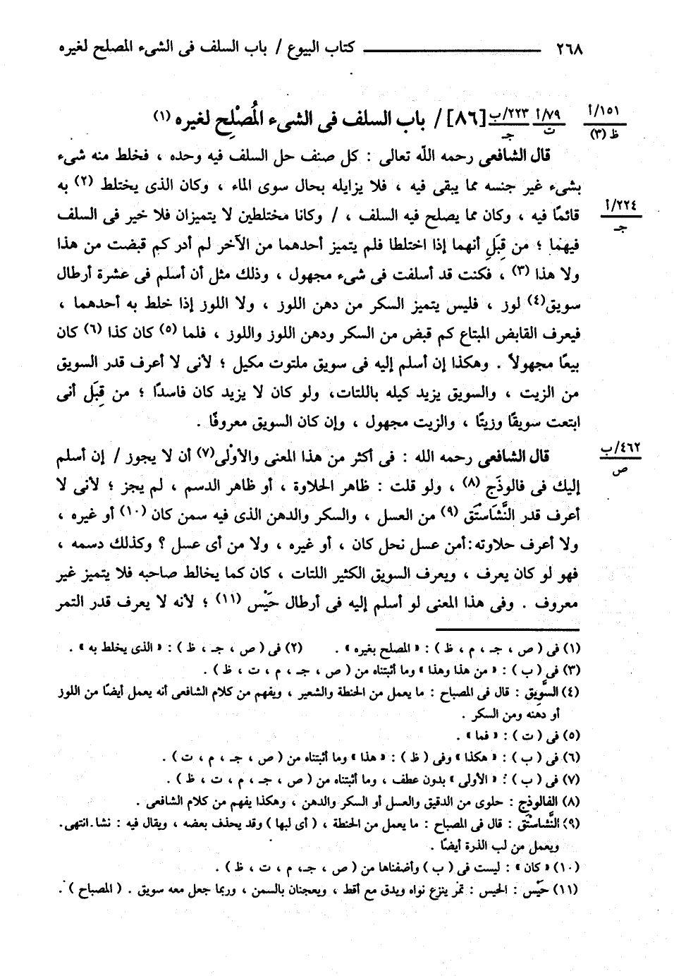 قَالَ الشَّافِعِيُّ : رحمه الله : كُلُّ صِنْفٍ حَلَّ السَّلَفُ فِيهِ وَحْدَهُ فَخُلِطَ مِنْهُ شَيْءٌ بِشَيْءٍ غَيْرِ جِنْسِهِ مِمَّا يَبْقَى فِيهِ فَلاَ يُزَايِلُهُ بِحَالٍ سِوَى الْمَاءِ وَكَانَ الَّذِي يَخْتَلِطُ بِهِ قَائِمًا فِيهِ وَكَانَ مِمَّا يَصْلُحُ فِيهِ السَّلَفُ وَكَانَا مُخْتَلِطَيْنِ لاَ يَتَمَيَّزَانِ فَلاَ خَيْرَ فِي السَّلَفِ فِيهِمَا مِنْ قِبَلِ أَنَّهُمَا إذَا اخْتَلَطَا فَلَمْ يَتَمَيَّزْ أَحَدُهُمَا مِنْ الْآخَرِ لَمْ أَدْرِ كَمْ قَبَضْت مِنْ هَذَا وَهَذَا ؟ فَكُنْت قَدْ أَسْلَفْت فِي شَيْءٍ مَجْهُولٍ وَذَلِكَ مِثْلُ أَنْ أُسْلِمَ فِي عَشْرَةِ أَرْطَالِ سَوِيقِ لَوْزٍ فَلَيْسَ يَتَمَيَّزُ السُّكَّرُ مِنْ دُهْنِ اللَّوْزِ , وَلاَ اللَّوْزُ إذَا خُلِطَ بِهِ أَحَدُهُمَا فَيَعْرِفُ الْقَابِضُ الْمُبْتَاعَ كَمْ قَبَضَ مِنْ السُّكَّرِ وَدُهْنِ اللَّوْزِ وَاللَّوْزِ فَلَمَّا كَانَ هَكَذَا كَانَ بَيْعًا مَجْهُولاً وَهَكَذَا إنْ أَسْلَمَ إلَيْهِ فِي سَوِيقٍ مَلْتُوتٍ مَكِيلٍ ; لِأَنِّي لاَ أَعْرِفُ قَدْرَ السَّوِيقِ مِنْ الزَّيْتِ وَالسَّوِيقُ يَزِيدُ كَيْلُهُ بِاللُّتَاتِ وَلَوْ كَانَ لاَ يَزِيدُ كَانَ فَاسِدًا مِنْ قِبَلِ أَنِّي ابْتَعْت سَوِيقًا وَزَيْتًا وَالزَّيْتُ مَجْهُولٌ , وَإِنْ كَانَ السَّوِيقُ مَعْرُوفًا .