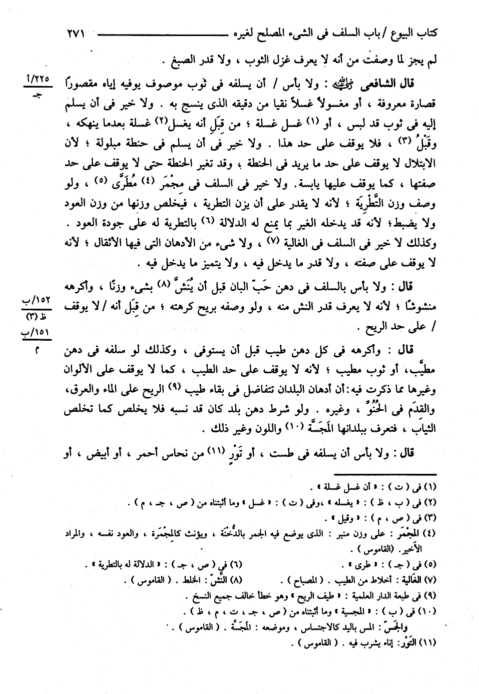 قال : وَلاَ بَأْسَ بِالسَّلَفِ فِي دُهْنِ حَبِّ الْبَانِ قَبْلَ أَنْ يَنُشَّ بِشَيْءٍ وَزْنًا وَأَكْرَهُهُ مَنْشُوشًا ; لِأَنَّهُ لاَ يَعْرِفُ قَدْرَ النَّشِّ مِنْهُ وَلَوْ وَصَفَهُ بِرِيحٍ كَرِهْته مِنْ قِبَلِ أَنَّهُ لاَ يُوقَفُ عَلَى حَدِّ الرِّيحِ قَالَ وَأَكْرَهُهُ فِي كُلِّ دُهْنٍ طَيِّبٍ قَبْلَ أَنْ يُسْتَوْفَى وَكَذَلِكَ لَوْ سَلَّفَهُ فِي دُهْنٍ مُطَيِّبٍ أَوْ ثَوْبٍ مُطَيَّبٍ ; لِأَنَّهُ لاَ يُوقَفُ عَلَى حَدِّ الطِّيبِ كَمَا لاَ يُوقَفُ عَلَى الْأَلْوَانِ وَغَيْرِهَا مِمَّا ذَكَرْت فِيهِ أَنَّ أَدْهَانَ الْبُلْدَانِ تَتَفَاضَلُ فِي بَقَاءِ طَيْفِ الرِّيحِ عَلَى الْمَاءِ وَالْعَرَقِ وَالْقَدَمِ فِي الْحُنُوِّ وَغَيْرِهِ وَلَوْ شَرَطَ دُهْنَ بَلَدٍ كَانَ قَدْ نَسَبَهُ فَلاَ يَخْلُصُ كَمَا تَخْلُصُ الثِّيَابُ فَتُعْرَفُ بِبُلْدَانِهَا المجسية وَاللَّوْنُ وَغَيْرُ ذَلِكَ قَالَ : وَلاَ بَأْسَ أَنْ يُسَلِّفَهُ فِي طَسْتٍ أَوْ تَوْرٍ مِنْ نُحَاسٍ أَحْمَرَ أَوْ أَبْيَضَ أَوْ@