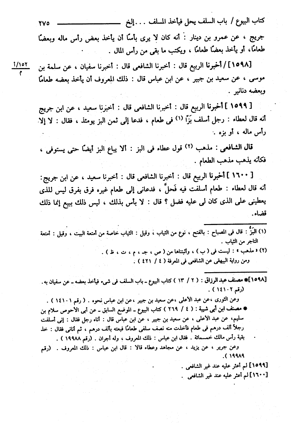 جُرَيْجٍ عَنْ عَمْرِو بْنِ دِينَارٍ أَنَّهُ كَانَ لاَ يَرَى بَأْسًا أَنْ يَأْخُذَ بَعْضَ رَأْسِ مَالِهِ وَبَعْضًا طَعَامًا أَوْ يَأْخُذَ بَعْضًا طَعَامًا وَيَكْتُبَ مَا بَقِيَ مِنْ رَأْسِ الْمَالِ ( أَخْبَرَنَا الرَّبِيعُ ) قَالَ أَخْبَرَنَا الشَّافِعِيُّ قَالَ أَخْبَرَنَا سُفْيَانُ عَنْ سَلَمَةَ بْنِ مُوسَى عَنْ سَعِيدِ بْنِ جُبَيْرٍ عَنْ ابْنِ عَبَّاسٍ قَالَ ذَلِكَ الْمَعْرُوفُ أَنْ يَأْخُذَ بَعْضَهُ طَعَامًا وَبَعْضَهُ دَنَانِيرَ . ( أَخْبَرَنَا الرَّبِيعُ ) قَالَ أَخْبَرَنَا الشَّافِعِيُّ قَالَ أَخْبَرَنَا سَعِيدٌ عَنْ ابْنِ جُرَيْجٍ أَنَّهُ قَالَ لِعَطَاءٍ رَجُلٌ أَسْلَفَ بَزًّا فِي طَعَامٍ فَدَعَا إلَى ثَمَنِ الْبَزِّ يَوْمَئِذٍ فَقَالَ لاَ إلَّا رَأْسَ مَالِهِ أَوْ بَزَّهُ