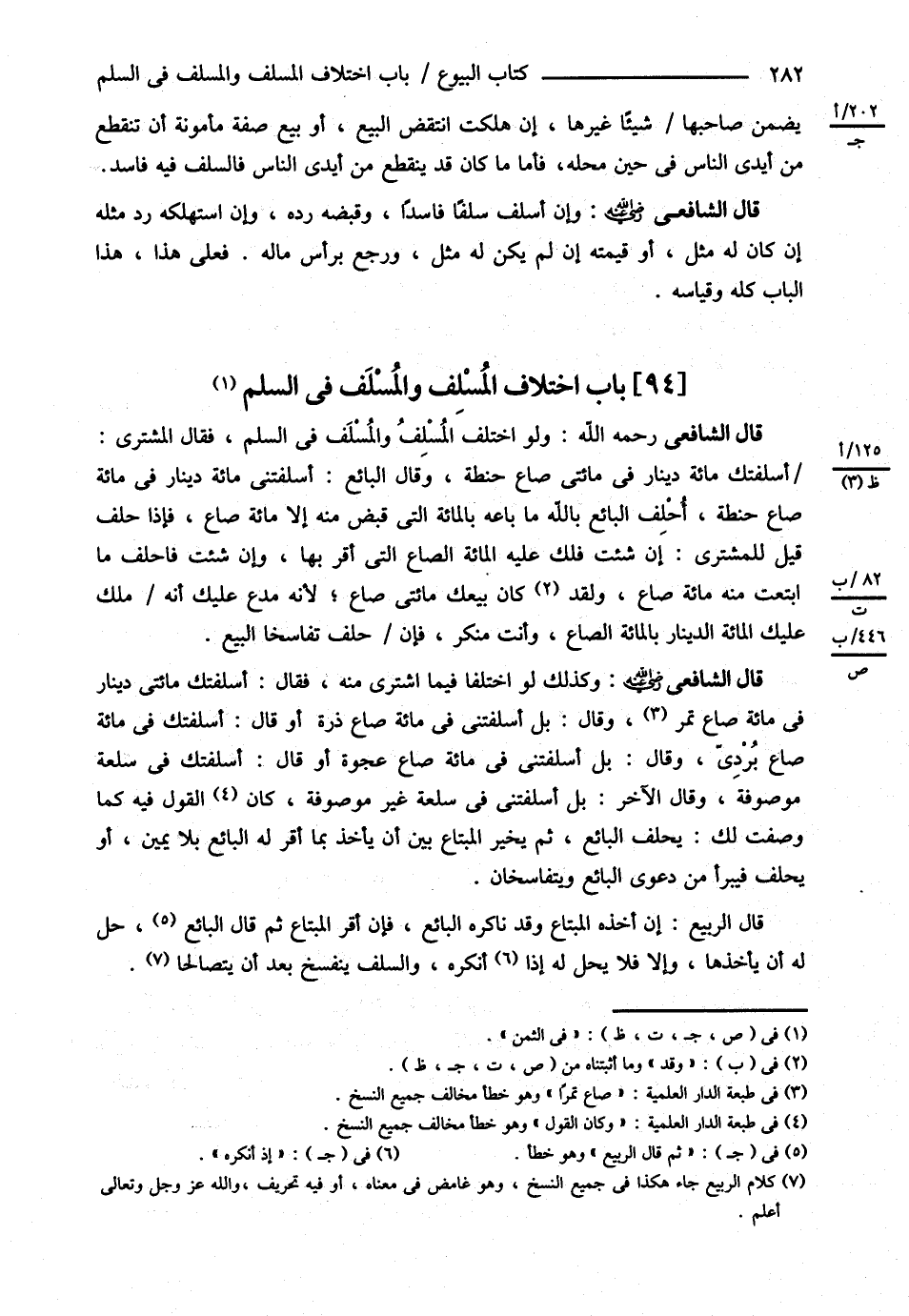 قَالَ الشَّافِعِيُّ : وَكَذَلِكَ لَوْ اخْتَلَفَا فِيمَا اشْتَرَى مِنْهُ فَقَالَ : أَسْلَفْتُك مِائَتَيْ دِينَارٍ فِي مِائَةِ صَاعٍ تَمْرًا , وَقَالَ : بَلْ أَسْلَفْتَنِي فِي مِائَةِ صَاعٍ ذُرَةً أَوْ قَالَ أَسْلَفْتُك فِي مِائَةِ صَاعٍ بَرْدِيًّا , وَقَالَ بَلْ أَسْلَفْتَنِي فِي مِائَةِ صَاعٍ عَجْوَةً أَوْ قَالَ أَسْلَفْتُك فِي سِلْعَةٍ مَوْصُوفَةٍ , وَقَالَ الْآخَرُ بَلْ أَسْلَفْتَنِي فِي سِلْعَةٍ غَيْرِ مَوْصُوفَةٍ كَانَ الْقَوْلُ فِيهِ كَمَا وَصَفْت لَك يَحْلِفُ الْبَائِعُ ثُمَّ يُخَيَّرُ الْمُبْتَاعُ بَيْنَ أَنْ يَأْخُذَ بِمَا أَقَرَّ لَهُ الْبَائِعُ بِلاَ يَمِينٍ أَوْ يَحْلِفَ فَيَبْرَأُ مِنْ دَعْوَى الْبَائِعِ وَيَتَفَاسَخَانِ . ( قَالَ الرَّبِيعُ ) : إنْ أَخَذَهُ الْمُبْتَاعُ , وَقَدْ نَاكَرَهُ الْبَائِعُ فَإِنْ أَقَرَّ الْمُبْتَاعُ ثُمَّ قَالَ الْبَائِعُ : حَلَّ لَهُ أَنْ يَأْخُذَهَا , وَإِلَّا فَلاَ يَحِلُّ لَهُ إذَا أَنْكَرَهُ , وَالسَّلَفُ يَنْفَسِخُ بَعْدَ أَنْ يَتَصَالَحَا .@