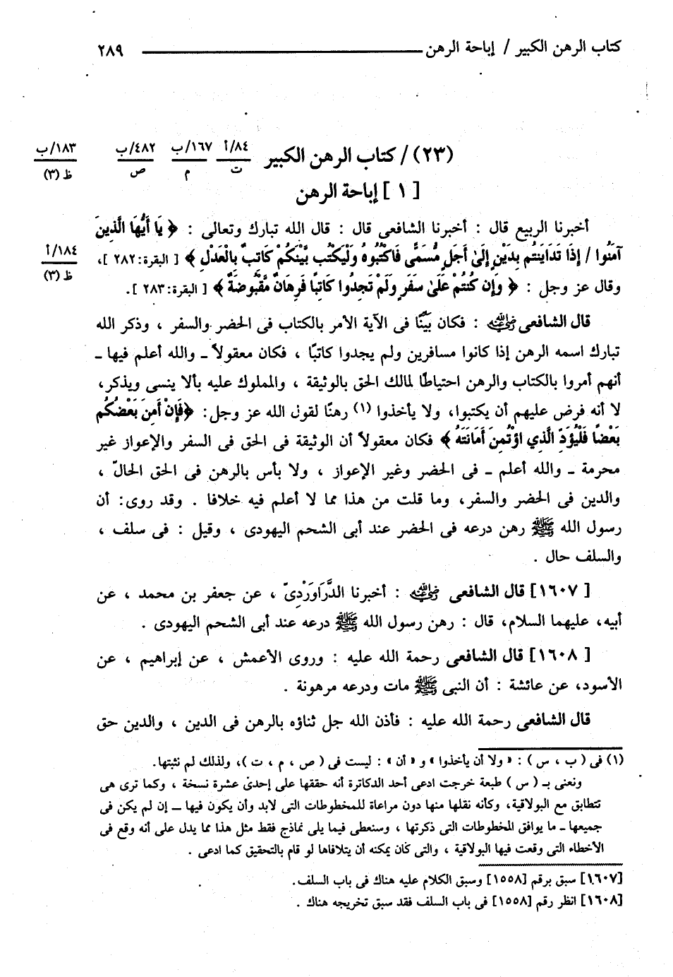 قَالَ الشَّافِعِيُّ: فَكَانَ بَيِّنًا فِي الآيَةِ الْأَمْرُ بِالْكِتَابِ فِي الْحَضَرِ وَالسَّفَرِ , وَذَكَرَ اللَّهُ - تَبَارَكَ اسْمَهُ - الرَّهْنَ إذَا كَانُوا مُسَافِرِينَ , وَلَمْ يَجِدُوا كَاتِبًا فَكَانَ مَعْقُولاً - وَاَللَّهُ أَعْلَمُ - فِيهَا: أَنَّهُمْ أُمِرُوا بِالْكِتَابِ وَالرَّهْنِ احْتِيَاطًا لِمَالِكِ الْحَقِّ بِالْوَثِيقَةِ وَالْمَمْلُوكُ عَلَيْهِ بِأَنْ لاَ يَنْسَى وَيَذْكُرَ لاَ أَنَّهُ فَرْضٌ عَلَيْهِمْ أَنْ يَكْتُبُوا , وَلاَ أَنْ يَأْخُذُوا رَهْنًا ; لِقَوْلِ اللَّهِ - عَزَّ وَجَلَّ - {فَإِنْ أَمِنَ بَعْضُكُمْ بَعْضًا فَلْيُؤَدِّ الَّذِي اُؤْتُمِنَ أَمَانَتَهُ} فَكَانَ مَعْقُولاً أَنَّ الْوَثِيقَةَ فِي الْحَقِّ فِي السَّفَرِ وَالْإِعْوَازِ غَيْرُ مُحَرَّمَةٍ - وَاَللَّهُ أَعْلَمُ - فِي الْحَضَرِ وَغَيْرِ الْإِعْوَازِ , وَلاَ بَأْسَ بِالرَّهْنِ فِي الْحَقِّ الْحَالِّ وَالدَّيْنِ فِي الْحَضَرِ وَالسَّفَرِ , وَمَا قُلْت مِنْ هَذَا مِمَّا لاَ أَعْلَمُ فِيهِ خِلاَفًا. وَقَدْ رُوِيَ {أَنَّ رَسُولَ اللَّهِ - صلى الله عليه وسلم - رَهَنَ دِرْعَهُ فِي الْحَضَرِ عِنْدَ أَبِي الشَّحْمِ الْيَهُودِيِّ} وَقِيلَ فِي سَلَفٍ وَالسَّلَفُ حَالٌّ قَالَ الشَّافِعِيُّ: أَخْبَرَنَا الدَّرَاوَرْدِيُّ عَنْ جَعْفَرِ بْنِ مُحَمَّدٍ عَنْ أَبِيهِ عليهما السلام قَالَ {رَهَنَ رَسُولُ اللَّهِ - صلى الله عليه وسلم - دِرْعَهُ عِنْدَ أَبِي الشَّحْمِ الْيَهُودِيِّ}