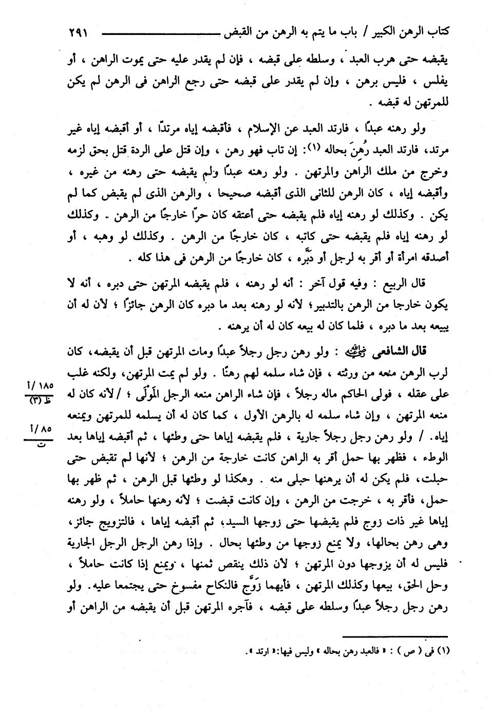 يَقْبِضْهُ حَتَّى هَرَبَ الْعَبْدُ وَسَلَّطَهُ عَلَى قَبْضِهِ فَإِنْ لَمْ يَقْدِرْ عَلَيْهِ حَتَّى يَمُوتَ الرَّاهِنُ أَوْ يُفْلِسَ فَلَيْسَ بِرَهْنٍ , وَإِنْ لَمْ يَقْدِرْ عَلَى قَبْضِهِ حَتَّى رَجَعَ الرَّاهِنُ فِي الرَّهْنِ لَمْ يَكُنْ لِلْمُرْتَهِنِ لَهُ قَبْضُهُ , وَلَوْ رَهَنَهُ عَبْدًا فَارْتَدَّ الْعَبْدُ عَنْ الْإِسْلاَمِ فَأَقْبَضَهُ إيَّاهُ مُرْتَدًّا أَوْ أَقْبَضَهُ إيَّاهُ غَيْرَ مُرْتَدٍّ فَارْتَدَّ فَالْعَبْدُ رَهْنٌ بِحَالِهِ إنْ تَابَ فَهُوَ رَهْنٌ , وَإِنْ قُتِلَ عَلَى الرِّدَّةِ قُتِلَ بِحَقٍّ لَزِمَهُ وَخَرَجَ مِنْ مِلْكِ الرَّاهِنِ وَالْمُرْتَهِنِ . وَلَوْ رَهَنَهُ عَبْدًا , وَلَمْ يَقْبِضْهُ حَتَّى رَهَنَهُ مِنْ غَيْرِهِ وَأَقْبَضَهُ إيَّاهُ كَانَ الرَّهْنُ لِلثَّانِي الَّذِي أَقْبَضَهُ صَحِيحًا , وَالرَّهْنُ الَّذِي لَمْ يُقْبَضْ كَمَا لَمْ يَكُنْ . وَكَذَلِكَ لَوْ رَهَنَهُ إيَّاهُ فَلَمْ يَقْبِضْهُ حَتَّى أَعْتَقَهُ كَانَ حُرًّا خَارِجًا مِنْ الرَّهْنِ . وَكَذَلِكَ لَوْ رَهَنَهُ إيَّاهُ فَلَمْ يَقْبِضْهُ حَتَّى كَاتَبَهُ كَانَ خَارِجًا مِنْ الرَّهْنِ . وَكَذَلِكَ لَوْ وَهَبَهُ أَوْ أَصْدَقَهُ امْرَأَةً أَوْ أَقَرَّ بِهِ لِرَجُلٍ أَوْ دَبَّرَهُ كَانَ خَارِجًا مِنْ الرَّهْنِ فِي هَذَا كُلِّهِ ( قَالَ الرَّبِيعُ ) وَفِيهِ قَوْلٌ آخَرُ أَنَّهُ لَوْ رَهَنَهُ فَلَمْ يَقْبِضْهُ الْمُرْتَهِنُ حَتَّى دَبَّرَهُ أَنَّهُ لاَ يَكُونُ خَارِجًا مِنْ الرَّهْنِ بِالتَّدْبِيرِ ; لِأَنَّهُ لَوْ رَهَنَهُ بَعْدَمَا دَبَّرَهُ كَانَ الرَّهْنُ جَائِزًا ; لِأَنَّ لَهُ أَنْ يَبِيعَهُ بَعْدَمَا دَبَّرَهُ فَلَمَّا كَانَ لَهُ بَيْعُهُ كَانَ لَهُ أَنْ يَرْهَنَهُ .