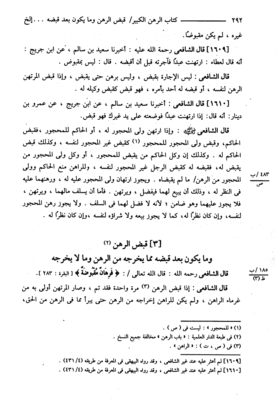 قَالَ الشَّافِعِيُّ : رحمه الله قَالَ اللَّهُ - تَعَالَى - { فَرِهَانٌ مَقْبُوضَةٌ }