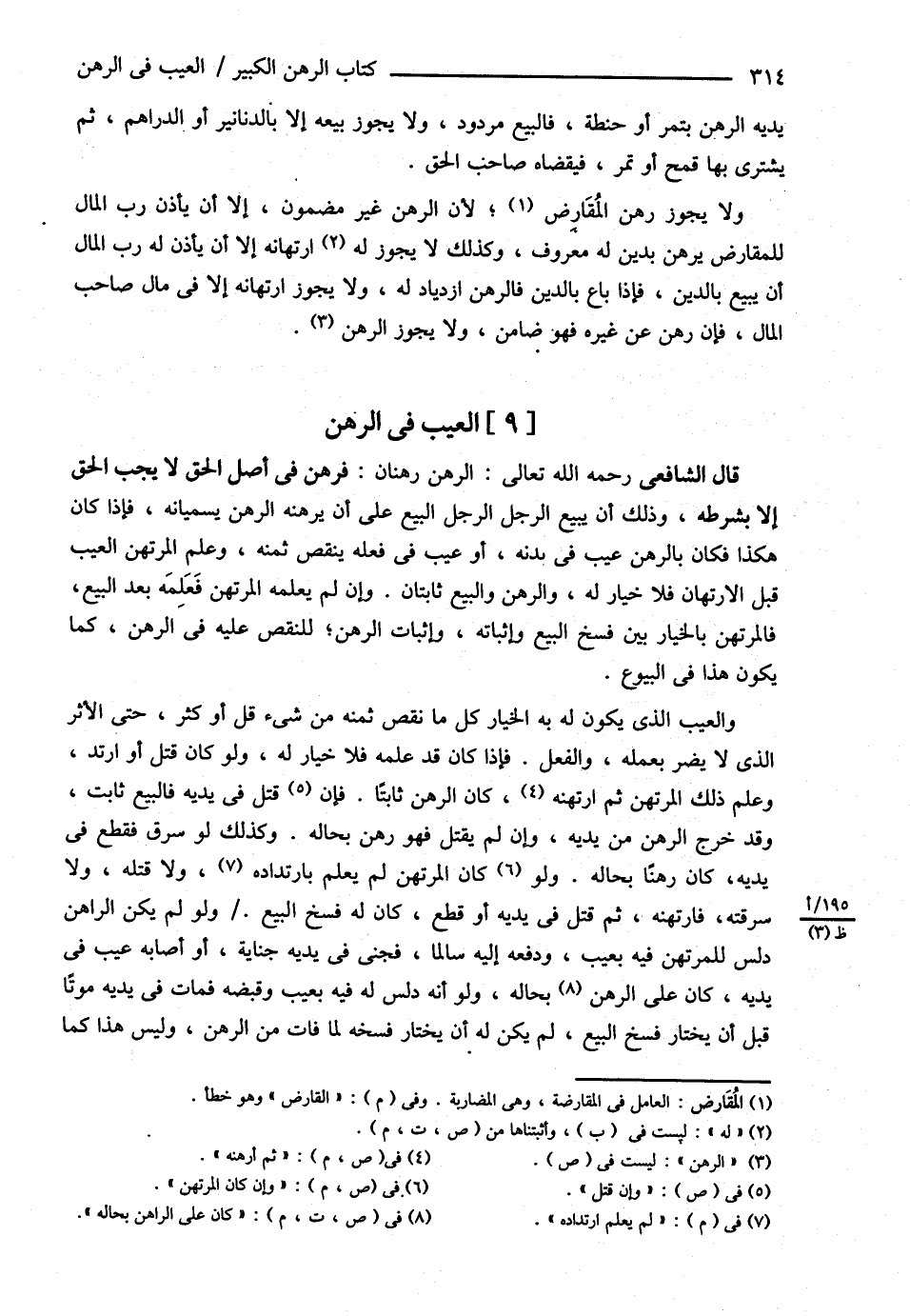 الْعَيْبُ فِي الرَّهْنِ . ( قَالَ : الشَّافِعِيُّ ) : رحمه الله تعالى : الرَّهْنُ رَهْنَانِ فَرَهْنٌ فِي أَصْلِ الْحَقِّ لاَ يَجِبُ الْحَقُّ إلَّا بِشَرْطِهِ وَذَلِكَ أَنْ يَبِيعَ الرَّجُلُ الرَّجُلَ الْبَيْعَ عَلَى أَنْ يَرْهَنَهُ الرَّهْنَ يُسَمِّيَانِهِ فَإِذَا كَانَ هَكَذَا فَكَانَ بِالرَّهْنِ عَيْبٌ فِي بَدَنِهِ أَوْ عَيْبٌ فِي فِعْلِهِ يُنْقِصُ ثَمَنَهُ وَعَلِمَ الْمُرْتَهِنُ الْعَيْبَ قَبْلَ الِارْتِهَانِ فَلاَ خِيَارَ لَهُ وَالرَّهْنُ وَالْبَيْعُ ثَابِتَانِ , وَإِنْ لَمْ يَعْلَمْهُ الْمُرْتَهِنُ فَعَلِمَهُ بَعْدَ الْبَيْعِ فَالْمُرْتَهِنُ بِالْخِيَارِ بَيْنَ فَسْخِ الْبَيْعِ , وَإِثْبَاتِهِ , وَإِثْبَاتِ الرَّهْنِ لِلنَّقْصِ عَلَيْهِ فِي الرَّهْنِ كَمَا يَكُونُ هَذَا فِي الْبُيُوعِ . وَالْعَيْبُ الَّذِي يَكُونُ لَهُ بِهِ الْخِيَارُ كُلُّ مَا نَقَصَ ثَمَنُهُ مِنْ شَيْءٍ قَلَّ أَوْ كَثُرَ حَتَّى الْأَثَرِ الَّذِي لاَ يَضُرُّ بِعَمَلِهِ وَالْفِعْلِ فَإِذَا كَانَ قَدْ عَلِمَهُ فَلاَ خِيَارَ لَهُ . وَلَوْ كَانَ قَتَلَ أَوْ ارْتَدَّ وَعَلِمَ ذَلِكَ الْمُرْتَهِنُ ثُمَّ ارْتَهَنَهُ كَانَ الرَّهْنُ ثَابِتًا فَإِنْ قُتِلَ فِي يَدَيْهِ فَالْبَيْعُ ثَابِتٌ , وَقَدْ خَرَجَ الرَّهْنُ مِنْ يَدَيْهِ , وَإِنْ لَمْ يُقْتَلُ فَهُوَ رَهْنٌ بِحَالِهِ , وَكَذَلِكَ لَوْ سَرَقَ فَقُطِعَ فِي يَدَيْهِ كَانَ رَهْنًا بِحَالِهِ , وَلَوْ كَانَ الْمُرْتَهِنُ لَمْ يَعْلَمْ بِارْتِدَادِهِ , وَلاَ قَتْلِهِ , وَلاَ سَرِقَتِهِ فَارْتَهَنَهُ ثُمَّ قُتِلَ فِي يَدِهِ أَوْ قُطِعَ كَانَ لَهُ فَسْخُ الْبَيْعِ . وَلَوْ لَمْ يَكُنْ الرَّاهِنُ دَلَّسَ لِلْمُرْتَهِنِ فِيهِ بِعَيْبٍ وَدَفَعَهُ إلَيْهِ سَالِمًا فَجَنَى فِي يَدَيْهِ جِنَايَةً أَوْ أَصَابَهُ عَيْبٌ فِي يَدَيْهِ كَانَ عَلَى الرَّهْنِ بِحَالِهِ , وَلَوْ أَنَّهُ دَلَّسَ لَهُ فِيهِ بِعَيْبٍ , وَقَبَضَهُ فَمَاتَ فِي يَدَيْهِ مَوْتًا قَبْلَ أَنْ يَخْتَارَ فَسْخَ الْبَيْعِ لَمْ يَكُنْ لَهُ أَنْ يَخْتَارَ فَسْخَهُ لِمَا فَاتَ مِنْ الرَّهْنِ , وَلَيْسَ هَذَا كَمَا@