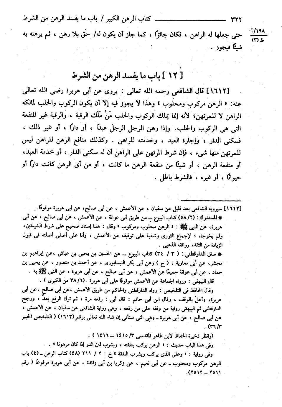قَالَ الشَّافِعِيُّ : رحمه الله تعالى يُرْوَى عَنْ أَبِي هُرَيْرَةَ رضي الله تعالى عنه { الرَّهْنُ مَرْكُوبٌ وَمَحْلُوبٌ } , وَهَذَا لاَ يَجُوزُ فِيهِ إلَّا أَنْ يَكُونَ الرُّكُوبُ وَالْحَلْبُ لِمَالِكِهِ الرَّاهِنِ لاَ لِلْمُرْتَهِنِ ; لِأَنَّهُ إنَّمَا يَمْلِكُ الرُّكُوبَ وَالْحَلْبَ مَنْ مَلَكَ الرَّقَبَةَ وَالرَّقَبَةُ غَيْرُ الْمَنْفَعَةِ الَّتِي هِيَ الرُّكُوبُ وَالْحَلْبُ , وَإِذَا رَهَنَ الرَّجُلُ الرَّجُلَ عَبْدًا أَوْ دَارًا أَوْ غَيْرَ ذَلِكَ فَسُكْنَى الدَّارِ , وَإِجَارَةُ الْعَبْدِ وَخِدْمَتُهُ لِلرَّاهِنِ , وَكَذَلِكَ مَنَافِعُ الرَّهْنِ لِلرَّاهِنِ لَيْسَ لِلْمُرْتَهِنِ مِنْهَا شَيْءٌ فَإِنْ شَرَطَ الْمُرْتَهِنُ عَلَى الرَّاهِنِ أَنَّ لَهُ سُكْنَى الدَّارِ أَوْ خِدْمَةَ الْعَبْدِ أَوْ مَنْفَعَةَ الرَّهْنِ أَوْ شَيْئًا مِنْ مَنْفَعَةِ الرَّهْنِ مَا كَانَتْ أَوْ مِنْ أَيِّ الرَّهْنِ كَانَتْ دَارًا أَوْ حَيَوَانًا أَوْ غَيْرِهِ فَالشَّرْطُ بَاطِلٌ @