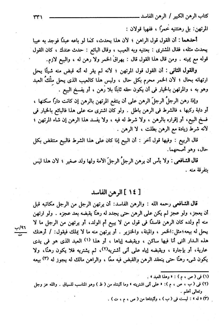 قَالَ الشَّافِعِيُّ : رحمه الله وَالرَّهْنُ الْفَاسِدُ أَنْ يَرْتَهِنَ الرَّجُلُ مِنْ الرَّجُلِ مُكَاتَبَهُ قَبْلَ أَنْ يَعْجِزَ , وَلَوْ عَجَزَ لَمْ يَكُنْ عَلَى الرَّهْنِ حَتَّى يُجَدِّدَ لَهُ رَهْنًا يَقْبِضُهُ بَعْدَ عَجْزِهِ , وَلَوْ ارْتَهَنَ مِنْهُ أُمَّ وَلَدِهِ كَانَ الرَّهْنُ فَاسِدًا فِي قَوْلِ مَنْ لاَ يَبِيعُ أُمَّ الْوَلَدِ أَوْ يَرْتَهِنُ مِنْ الرَّجُلِ مَا لاَ يَحِلُّ لَهُ بَيْعُهُ مِثْلَ الْخَمْرِ وَالْمَيْتَةِ وَالْخِنْزِيرِ أَوْ يَرْتَهِنُ مِنْهُ مَا لاَ يَمْلِكُ فَيَقُولُ أَرْهَنُك هَذِهِ الدَّارَ الَّتِي أَنَا فِيهَا سَاكِنٌ وَيُقْبِضُهُ إيَّاهَا , أَوْ هَذَا الْعَبْدَ الَّذِي هُوَ فِي يَدَيَّ عَارِيَّةً أَوْ بِإِجَارَةٍ وَيُقْبِضُهُ إيَّاهُ عَلَى أَنِّي اشْتَرَيْته ثُمَّ يَشْتَرِيهِ فَلاَ يَكُونُ رَهْنًا , وَلاَ يَكُونُ شَيْءٌ رَهْنًا حَتَّى يَنْعَقِدَ الرَّهْنُ وَالْقَبْضُ فِيهِ وَالرَّاهِنُ مَالِكٌ لاَ يَجُوزُ له بَيْعُهُ@