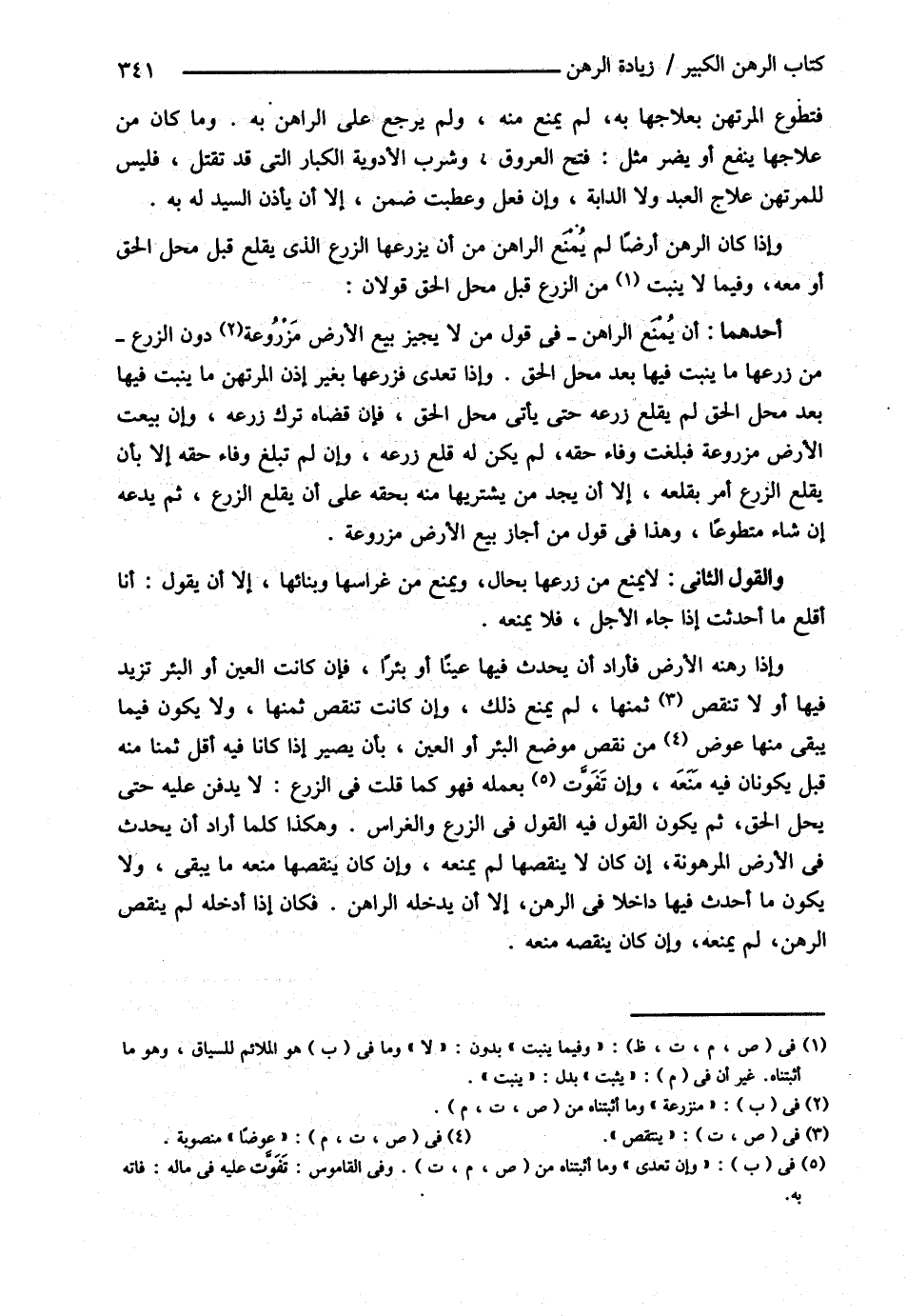 فَتَطَوَّعَ الْمُرْتَهِنُ بِعِلاَجِهَا بِهِ لَمْ يُمْنَعْ مِنْهُ , وَلَمْ يَرْجِعْ عَلَى الرَّاهِنِ بِهِ . وَمَا كَانَ مِنْ عِلاَجِهَا يَنْفَعُ أَوْ يَضُرُّ مِثْلَ فَتْحِ الْعُرُوقِ وَشُرْبِ الْأَدْوِيَةِ الْكِبَارِ الَّتِي قَدْ تَقْتُلُ فَلَيْسَ لِلْمُرْتَهِنِ عِلاَجُ الْعَبْدِ , وَلاَ الدَّابَّةِ , وَإِنْ فَعَلَ وَعَطِبَتْ ضَمِنَ إلَّا أَنْ يَأْذَنَ السَّيِّدُ لَهُ بِهِ , وَإِذَا كَانَ الرَّهْنُ أَرْضًا لَمْ يُمْنَعْ الرَّاهِنُ مِنْ أَنْ يَزْرَعَهَا الزَّرْعَ الَّذِي يُقْلَعُ قَبْلَ مَحِلِّ الْحَقِّ أَوْ مَعَهُ وَفِيمَا لاَ يَنْبُتُ مِنْ الزَّرْعِ قَبْلَ مَحِلِّ الْحَقِّ قَوْلاَنِ . أَحَدُهُمَا : أَنْ يُمْنَعَ الرَّاهِنُ فِي قَوْلِ مَنْ لاَ يُجِيزُ بَيْعَ الْأَرْضِ مَنْزُوعَةً دُونَ الزَّرْعِ مِنْ زَرْعِهَا مَا يَنْبُتُ فِيهَا بَعْدَ مَحِلِّ الْحَقِّ , وَإِذَا تَعَدَّى فَزَرَعَهَا بِغَيْرِ إذْنِ الْمُرْتَهِنِ مَا يَنْبُتُ فِيهَا بَعْدَ مَحِلِّ الْحَقِّ لَمْ يُقْلَعْ زَرْعُهُ حَتَّى يَأْتِيَ مَحِلُّ الْحَقِّ فَإِنْ قَضَاهُ تَرَكَ زَرْعَهُ , وَإِنْ بِيعَتْ الْأَرْضُ مَزْرُوعَةً فَبَلَغَتْ وَفَاءَ حَقِّهِ لَمْ يَكُنْ لَهُ قَلْعُ زَرْعِهِ , وَإِنْ لَمْ تَبْلُغْ وَفَاءَ حَقِّهِ إلَّا بِأَنْ يُقْلَعَ الزَّرْعُ أَمَرَ بِقَلْعِهِ إلَّا أَنْ يَجِدَ مَنْ يَشْتَرِيهَا مِنْهُ بِحَقِّهِ عَلَى أَنْ يَقْلَعَ الزَّرْعَ ثُمَّ يَدَعَهُ إنْ شَاءَ مُتَطَوِّعًا . وَهَذَا فِي قَوْلِ مَنْ أَجَازَ بَيْعَ الْأَرْضِ مَزْرُوعَةً . وَالْقَوْلُ الثَّانِي : لاَ يُمْنَعُ مِنْ زَرْعِهَا بِحَالٍ وَيُمْنَعُ مِنْ غِرَاسِهَا وَبِنَائِهَا إلَّا أَنْ يَقُولَ : أَنَا أَقْلَعُ مَا أَحْدَثْت إذَا جَاءَ الْأَجَلُ فَلاَ يَمْنَعُهُ . وَإِذَا رَهَنَهُ الْأَرْضَ فَأَرَادَ أَنْ يُحْدِثَ فِيهَا عَيْنًا أَوْ بِئْرًا فَإِنْ كَانَتْ الْعَيْنُ أَوْ الْبِئْرُ تَزِيدُ فِيهَا أَوْ لاَ تَنْقُصُ ثَمَنَهَا لَمْ يَمْنَعْ ذَلِكَ , وَإِنْ كَانَتْ تَنْقُصُ ثَمَنَهَا , وَلاَ يَكُونُ فِيمَا يَبْقَى مِنْهَا عِوَضٌ مِنْ نَقْصِ مَوْضِعِ الْبِئْرِ أَوْ الْعَيْنِ بِأَنْ يَصِيرَ إذَا كَانَا فِيهِ أَقَلَّ ثَمَنًا مِنْهُ قَبْلَ يَكُونَانِ فِيهِ مَنَعَهُ , وَإِنْ تَعَدَّى بِعَمَلِهِ فَهُوَ كَمَا قُلْت فِي الزَّرْعِ لاَ يَدْفِنُ عَلَيْهِ حَتَّى يَحِلَّ الْحَقُّ ثُمَّ يَكُونُ الْقَوْلُ فِيهِ الْقَوْلَ فِي الزَّرْعِ وَالْغِرَاسِ , وَهَكَذَا كُلَّمَا أَرَادَ أَنْ يُحْدِثَ فِي الْأَرْضِ الْمَرْهُونَةِ إنْ كَانَ لاَ يَنْقُصُهَا لَمْ يَمْنَعْهُ , وَإِنْ كَانَ يَنْقُصُهَا مَنَعَهُ مَا يَبْقَى , وَلاَ يَكُونُ مَا أَحْدَثَ فِيهَا دَاخِلاً فِي الرَّهْنِ إلَّا أَنْ يُدْخِلَهُ الرَّاهِنُ فَكَانَ إذَا أَدْخَلَهُ لَمْ يَنْقُصْ الرَّهْنُ لَمْ يَمْنَعْهُ , وَإِنْ كَانَ يَنْقُصُهُ مَنَعَهُ@