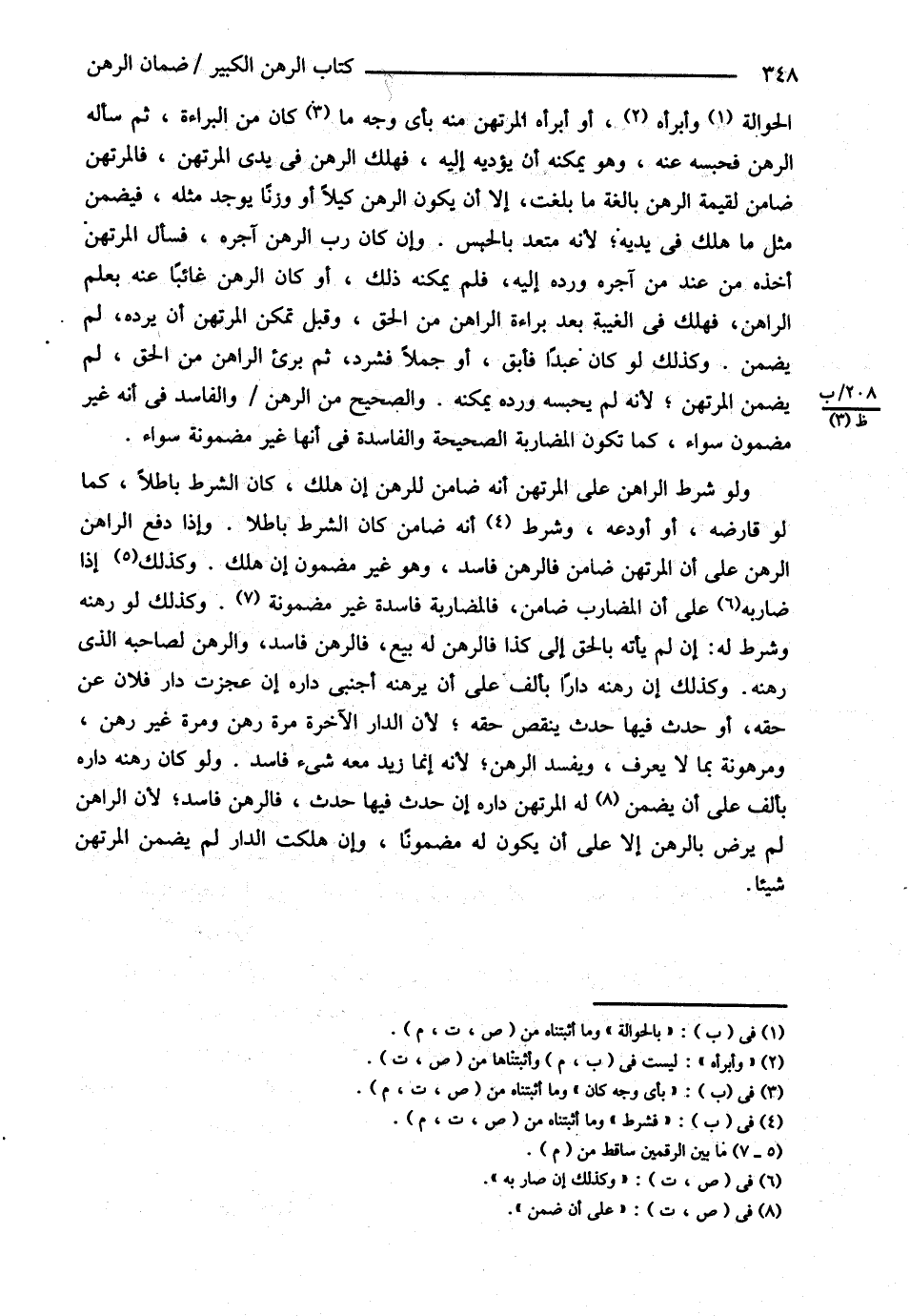 الْحَوَالَةِ أَوْ أَبْرَأَهُ الْمُرْتَهِنُ مِنْهُ بِأَيِّ وَجْهٍ كَانَ مِنْ الْبَرَاءَةِ ثُمَّ سَأَلَهُ الرَّهْنَ فَحَبَسَهُ عَنْهُ , وَهُوَ يُمْكِنُهُ أَنْ يُؤَدِّيَهُ إلَيْهِ فَهَلَكَ الرَّهْنُ فِي يَدَيْ الْمُرْتَهِنِ فَالْمُرْتَهِنُ ضَامِنٌ لِقِيمَةِ الرَّهْنِ بَالِغَةً مَا بَلَغَتْ إلَّا أَنْ يَكُونَ الرَّهْنُ كَيْلاً أَوْ وَزْنًا يُوجَدُ مِثْلُهُ فَيَضْمَنُ مِثْلَ مَا هَلَكَ فِي يَدَيْهِ ; لِأَنَّهُ مُتَعَدٍّ بِالْحَبْسِ . وَإِنْ كَانَ رَبُّ الرَّهْنِ آجَرَهُ فَسَأَلَ الْمُرْتَهِنَ أَخْذَهُ مِنْ عِنْدِ مَنْ آجَرَهُ وَرَدَّهُ إلَيْهِ فَلَمْ يُمْكِنْهُ ذَلِكَ أَوْ كَانَ الرَّهْنُ غَائِبًا عَنْهُ بِعِلْمِ الرَّاهِنِ فَهَلَكَ فِي الْغَيْبَةِ بَعْدَ بَرَاءَةِ الرَّاهِنِ مِنْ الْحَقِّ , وَقَبْلَ تَمَكُّنِ الْمُرْتَهِنِ أَنْ يَرُدَّهُ لَمْ يَضْمَنْ . وَكَذَلِكَ لَوْ كَانَ عَبْدًا فَأَبَقَ أَوْ جَمَلاً فَشَرَدَ ثُمَّ بَرِئَ الرَّاهِنُ مِنْ الْحَقِّ لَمْ يَضْمَنْ الْمُرْتَهِنُ ; لِأَنَّهُ لَمْ يَحْبِسْهُ وَرَدُّهُ يُمْكِنُهُ , وَالصَّحِيحُ مِنْ الرَّهْنِ وَالْفَاسِدُ فِي أَنَّهُ غَيْرُ مَضْمُونٍ سَوَاءٌ كَمَا تَكُونُ الْمُضَارَبَةُ الصَّحِيحَةُ وَالْفَاسِدَةُ فِي أَنَّهَا غَيْرُ مَضْمُونَةٍ سَوَاءٌ , وَلَوْ شَرَطَ الرَّاهِنُ عَلَى الْمُرْتَهِنِ أَنَّهُ ضَامِنٌ لِلرَّهْنِ إنْ هَلَكَ كَانَ الشَّرْطُ بَاطِلاً , كَمَا لَوْ قَارَضَهُ أَوْ أَوْدَعَهُ فَشَرَطَ أَنَّهُ ضَامِنٌ كَانَ الشَّرْطُ بَاطِلاً . وَإِذَا دَفَعَ الرَّاهِنُ الرَّهْنَ عَلَى أَنَّ الْمُرْتَهِنَ ضَامِنٌ فَالرَّهْنُ فَاسِدٌ , وَهُوَ غَيْرُ مَضْمُونٍ إنْ هَلَكَ , وَكَذَلِكَ إذَا ضَارَبَهُ عَلَى أَنَّ الْمُضَارِبَ ضَامِنٌ فَالْمُضَارَبَةُ فَاسِدَةٌ غَيْرُ مَضْمُونَةٍ . وَكَذَلِكَ لَوْ رَهَنَهُ وَشَرَطَ لَهُ إنْ لَمْ يَأْتِهِ بِالْحَقِّ إلَى كَذَا فَالرَّهْنُ لَهُ بَيْعٌ فَالرَّهْنُ فَاسِدٌ وَالرَّهْنُ لِصَاحِبِهِ الَّذِي رَهَنَهُ , وَكَذَلِكَ إنْ رَهَنَهُ دَارًا بِأَلْفٍ عَلَى أَنْ يَرْهَنَهُ أَجْنَبِيٌّ دَارِهِ إنْ عَجَزَتْ دَارُ فُلاَنٍ عَنْ حَقِّهِ أَوْ حَدَثَ فِيهَا حَدَثٌ يُنْقِصُ حَقَّهُ ; لِأَنَّ الدَّارَ الْآخِرَةَ مَرَّةً رَهْنٌ , وَمَرَّةً غَيْرُ رَهْنٍ , وَمَرْهُونَةٌ بِمَا لاَ يُعْرَفُ وَيَفْسُدُ الرَّهْنُ ; لِأَنَّهُ إنَّمَا زِيدَ مَعَهُ شَيْءٌ فَاسِدٌ . وَلَوْ كَانَ رَهَنَهُ دَارِهِ بِأَلْفٍ عَلَى أَنْ يَضْمَنَ لَهُ الْمُرْتَهِنُ دَارِهِ إنْ حَدَثَ فِيهَا حَدَثٌ فَالرَّهْنُ فَاسِدٌ ; لِأَنَّ الرَّاهِنَ لَمْ يَرْضَ بِالرَّهْنِ إلَّا عَلَى أَنْ يَكُونَ لَهُ مَضْمُونًا , وَإِنْ هَلَكَتْ الدَّارُ لَمْ يَضْمَنْ الْمُرْتَهِنُ شَيْئًا .@