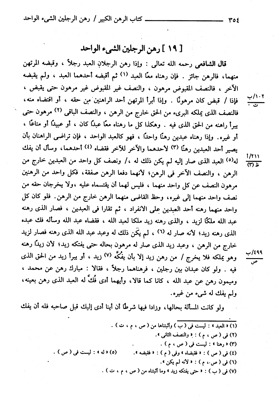 قَالَ الشَّافِعِيُّ : رحمه الله تعالى وَإِذَا رَهَنَ الرَّجُلاَنِ الْعَبْدَ رَجُلاً , وَقَبَضَهُ الْمُرْتَهِنُ مِنْهُمَا فَالرَّهْنُ جَائِزٌ فَإِنْ رَهَنَاهُ مَعًا ثُمَّ أَقْبَضَهُ أَحَدُهُمَا الْعَبْدَ , وَلَمْ يُقْبِضْهُ الْآخَرُ فَالنِّصْفُ الْمَقْبُوضُ مَرْهُونٌ وَالنِّصْفُ غَيْرُ الْمَقْبُوضِ غَيْرُ مَرْهُونٍ حَتَّى يُقْبَضَ فَإِذَا قُبِضَ كَانَ مَرْهُونًا , وَإِذَا أَبْرَأَ الْمُرْتَهِنُ أَخْذَ الرَّاهِنَيْنِ مِنْ حَقِّهِ أَوْ اقْتَضَاهُ مِنْهُ فَالنِّصْفُ الَّذِي يَمْلِكُهُ الْبَرِيءُ مِنْ الْحَقِّ خَارِجٌ مِنْ الرَّهْنِ , وَالنِّصْفُ الْبَاقِي مَرْهُونٌ حَتَّى يَبْرَأَ رَاهِنُهُ مِنْ الْحَقِّ الَّذِي فِيهِ , وَهَكَذَا كُلُّ مَا رَهَنَاهُ مَعًا عَبْدًا كَانَ أَوْ عَبِيدًا أَوْ مَتَاعًا أَوْ غَيْرَهُ . وَإِذَا رَهَنَاهُ عَبْدَيْنِ رَهْنًا وَاحِدًا فَهُوَ كَالْعَبْدِ الْوَاحِدِ فَإِنْ تَرَاضَى الرَّاهِنَانِ بِأَنْ يَصِيرَ أَحَدُ الْعَبْدَيْنِ رَهْنًا لِأَحَدِهِمَا وَالْآخَرُ لِلْآخَرِ فَقَضَاهُ أَحَدُهُمَا وَسَأَلَ أَنْ يَفُكَّ لَهُ الْعَبْدَ الَّذِي صَارَ إلَيْهِ لَمْ يَكُنْ ذَلِكَ لَهُ وَنِصْفُ كُلِّ وَاحِدٍ مِنْ الْعَبْدَيْنِ خَارِجٌ مِنْ الرَّهْنِ , وَالنِّصْفُ الْآخَرُ فِي الرَّهْنِ ; لِأَنَّهُمَا دَفَعَا الرَّهْنَ صَفْقَةً فَكُلُّ وَاحِدٍ مِنْ الرَّهْنَيْنِ مَرْهُونُ النِّصْفِ عَنْ كُلِّ وَاحِدٍ مِنْهُمَا فَلَيْسَ لَهُمَا أَنْ يَقْتَسِمَاهُ عَلَيْهِ , وَلاَ يُخْرِجَانِ حَقَّهُ مِنْ نِصْفِ وَاحِدٍ مِنْهُمَا إلَى غَيْرِهِ وَحَظُّ الْقَاضِي مِنْهُمَا الرَّهْنَ خَارِجٌ مِنْ الرَّهْنِ . فَلَوْ كَانَ كُلُّ وَاحِدٍ مِنْهُمَا رَهَنَهُ أَحَدَ الْعَبْدَيْنِ عَلَى الِانْفِرَادِ ثُمَّ تَقَارَّا فِي الْعَبْدَيْنِ فَصَارَ الَّذِي رَهَنَهُ عَبْدُ اللَّهِ مِلْكًا لِزَيْدٍ وَاَلَّذِي رَهَنَهُ زَيْدٌ مِلْكًا لِعَبْدِ اللَّهِ فَقَضَاهُ عَبْدُ اللَّهِ وَسَأَلَهُ فَكَّ عَبْدِهِ الَّذِي رَهَنَهُ زَيْدٌ ; لِأَنَّهُ صَارَ لَهُ لَمْ يَكُنْ ذَلِكَ لَهُ وَعَبْدُ عَبْدِ اللَّهِ الَّذِي رَهَنَهُ فَصَارَ لِزَيْدٍ خَارِجٌ مِنْ الرَّهْنِ وَعَبْدُ زَيْدٍ الَّذِي صَارَ لَهُ مَرْهُونٌ بِحَالِهِ حَتَّى يَفْتَكَّهُ زَيْدٌ ; لِأَنَّ زَيْدًا رَهَنَهُ , وَهُوَ يَمْلِكُهُ فَلاَ يَخْرُجُ مِنْ رَهْنِ زَيْدٍ حَتَّى يَفْتَكَّهُ زَيْدٌ أَوْ يَبْرَأَ زَيْدٌ مِنْ الْحَقِّ الَّذِي فِيهِ , وَلَوْ كَانَ عَبْدَانِ بَيْنَ رَجُلَيْنِ فَرَهَنَاهُمَا رَجُلاً فَقَالاَ مُبَارَكٌ رَهْنٌ عَنْ مُحَمَّدٍ , وَمَيْمُونٌ رَهْنٌ عَنْ عَبْدِ اللَّهِ كَانَا كَمَا قَالَ : وَأَيُّهُمَا أَدَّى فُكَّ لَهُ الْعَبْدُ الَّذِي رَهَنَ بِعَيْنِهِ , وَلَمْ يُفَكَّ لَهُ شَيْءٌ مِنْ غَيْرِهِ . وَلَوْ كَانَتْ الْمَسْأَلَةُ بِحَالِهَا وَزَادَ فِيهَا شَرْطًا أَنَّ أَيَّنَا أَدَّى إلَيْك قَبْلَ صَاحِبِهِ فَلَهُ أَنْ يَفُكَّ@